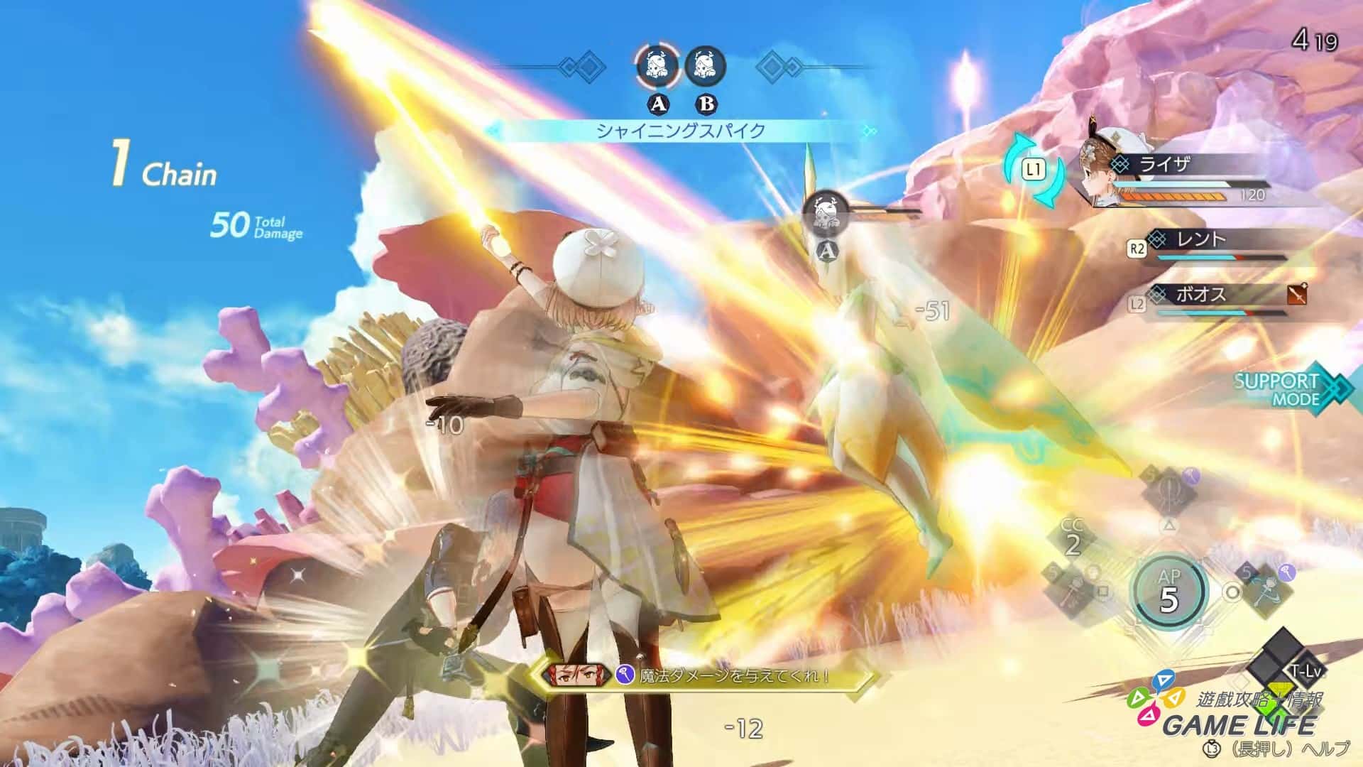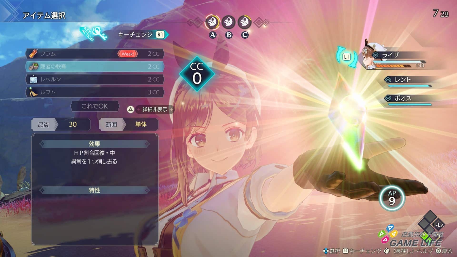 《萊莎的鍊金工房 3》的戰鬥節奏也變得更加流暢快速了,最明顯的地方就是招式的使用。戰鬥中會累積 CC 跟 AP 兩個數值,消耗 CC 可以使用事前鍊金與裝備好的道具。相對的 AP 就是消耗來讓玩家使用普通攻擊以外的各種招式。