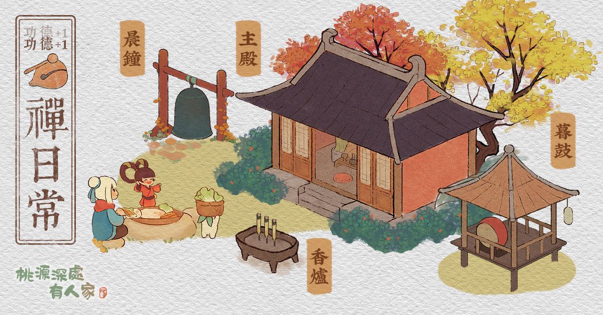 星宿科技正式宣布,模擬經營手遊《桃源深處有人家》全新版本「山居問禪」上線,同時,遊戲內解鎖全新區域「蘿山寺」,修繕蘿山寺後可解鎖新建築藏經室及禪物坊。透過一日經玩法在藏經室可以獲取特殊物品,可在蘿山寺區域內的主殿、晨鐘、香爐、暮鼓進行使用。並增加自身的心境,心境到達一定等級後,就可以獲取不同獎勵。也可以透過消耗一定數量的資源在禪物坊工作,取得蘿山寺專屬建築,讓蘿蘿山變得更多彩多樣。