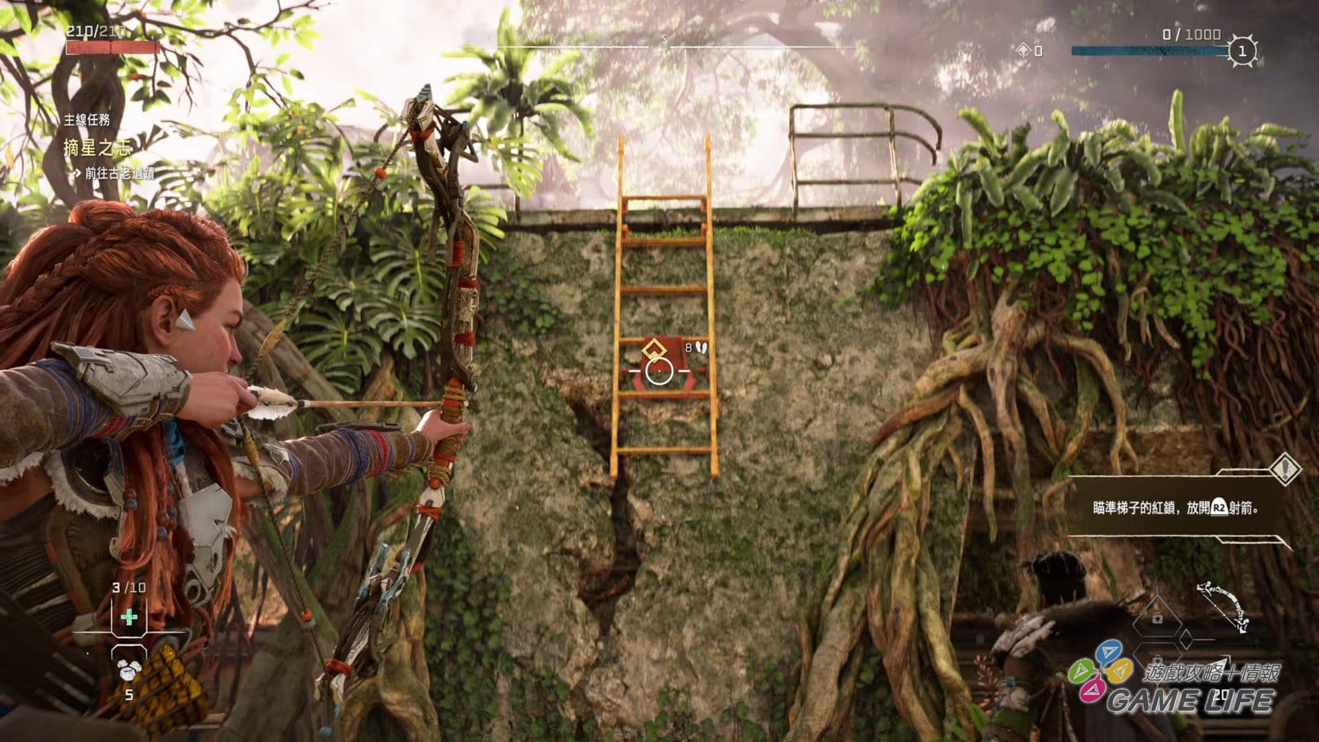 本次新的動作系統,一個是上述的「潛水」,能深入水中進行探索,所以這回還有「氧氣」計量表,和多數遊戲不同的地方是「氧氣」用完就會死亡,不會溫柔地還慢慢扣體力(中後期獲得氧氣罩就能盡情潛水)。另一個新動作要素就是「勾繩」,這次特定地點可以透過勾繩「飛」上高處,還可以用勾繩拉扯,將妨礙路線的巨大岩石或樹幹直接拉走,所以能說本作的 Aloy 是「力大無窮」,既然如此,稍微設計得「有肉」一點也沒關係。
