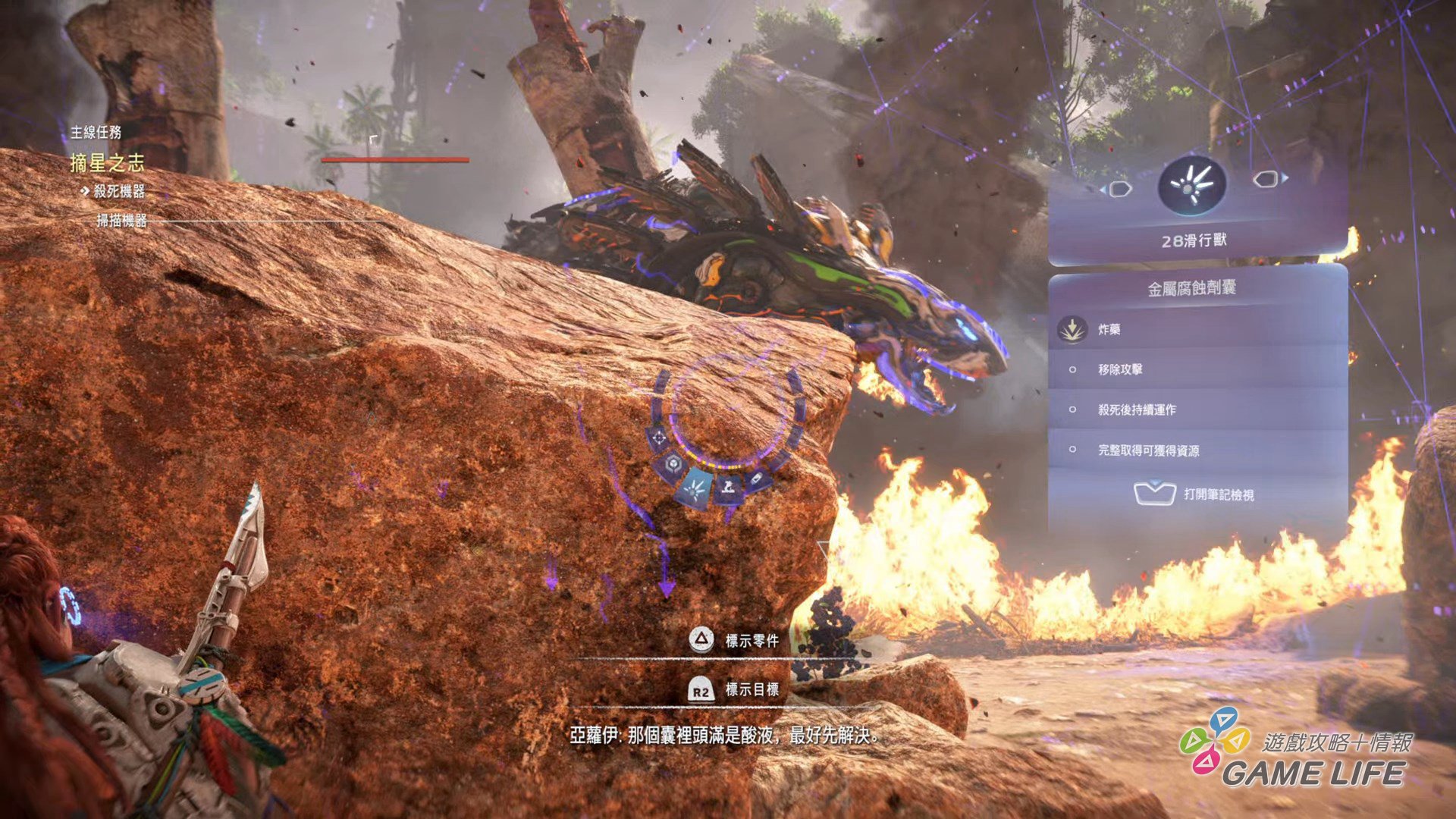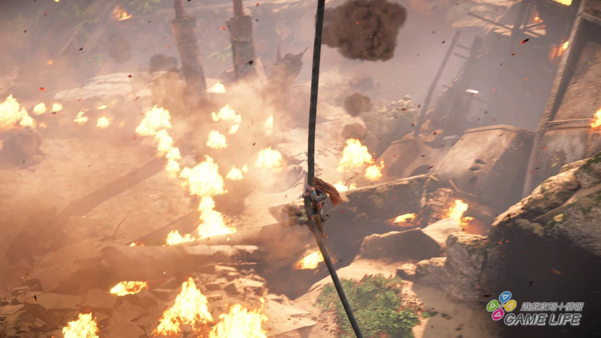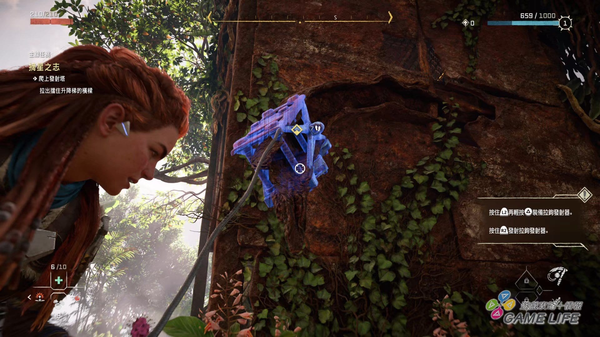 本次新的動作系統,一個是上述的「潛水」,能深入水中進行探索,所以這回還有「氧氣」計量表,和多數遊戲不同的地方是「氧氣」用完就會死亡,不會溫柔地還慢慢扣體力(中後期獲得氧氣罩就能盡情潛水)。另一個新動作要素就是「勾繩」,這次特定地點可以透過勾繩「飛」上高處,還可以用勾繩拉扯,將妨礙路線的巨大岩石或樹幹直接拉走,所以能說本作的 Aloy 是「力大無窮」,既然如此,稍微設計得「有肉」一點也沒關係。