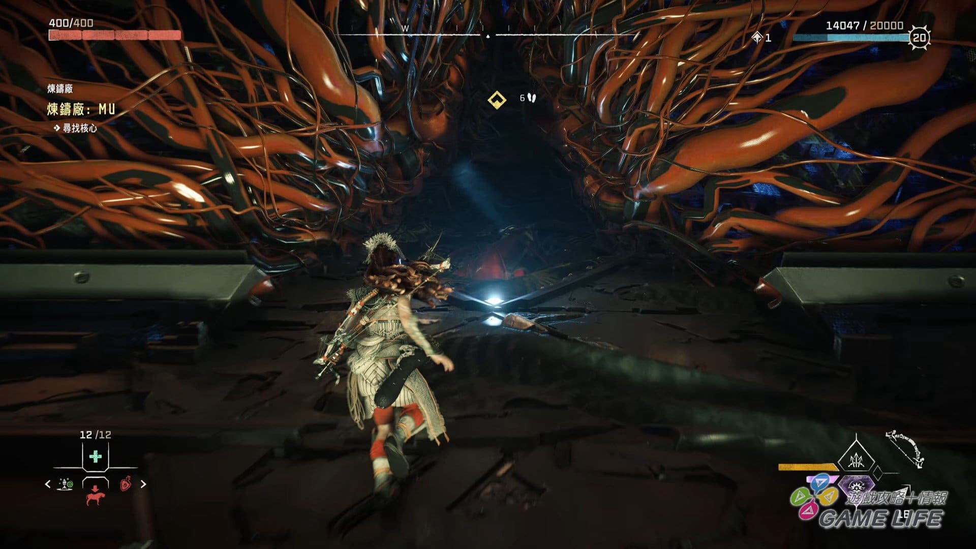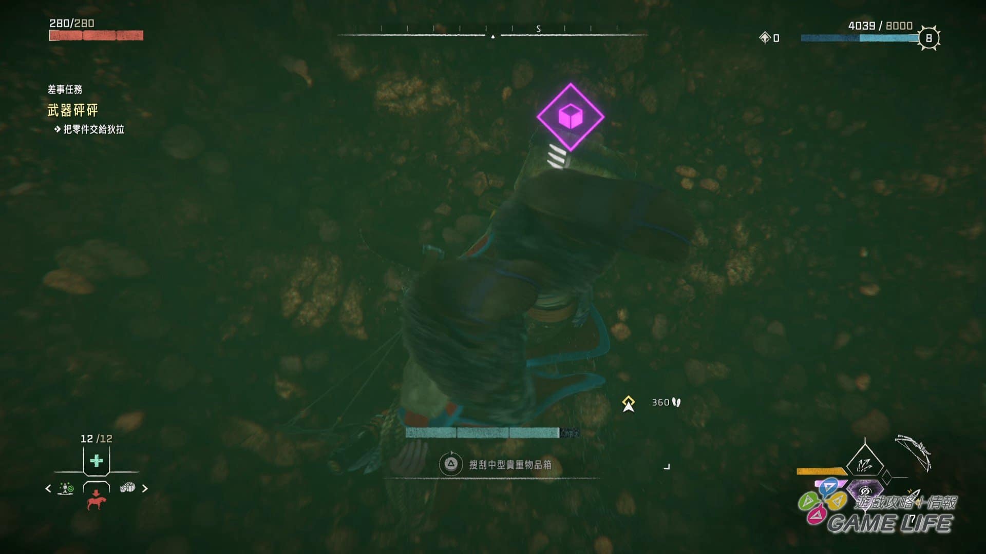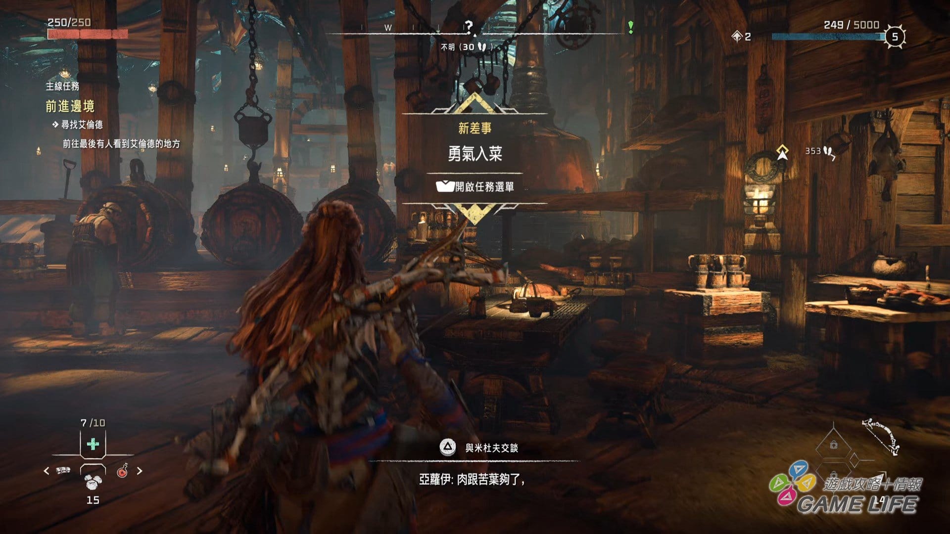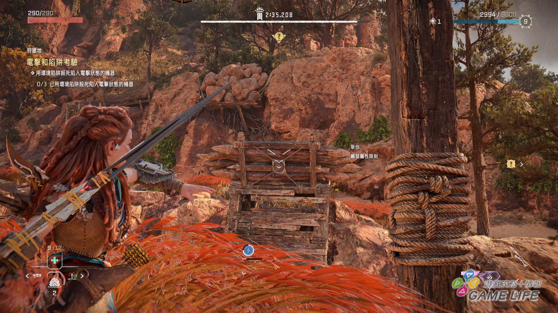 本次新的動作系統,一個是上述的「潛水」,能深入水中進行探索,所以這回還有「氧氣」計量表,和多數遊戲不同的地方是「氧氣」用完就會死亡,不會溫柔地還慢慢扣體力(中後期獲得氧氣罩就能盡情潛水)。另一個新動作要素就是「勾繩」,這次特定地點可以透過勾繩「飛」上高處,還可以用勾繩拉扯,將妨礙路線的巨大岩石或樹幹直接拉走,所以能說本作的 Aloy 是「力大無窮」,既然如此,稍微設計得「有肉」一點也沒關係。