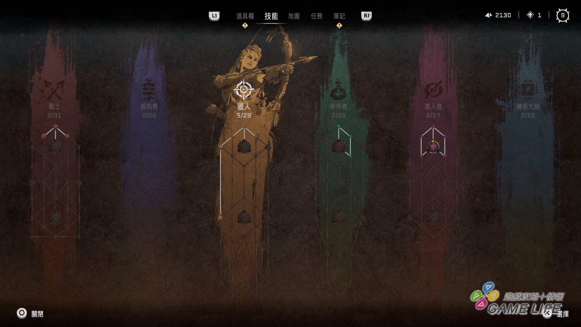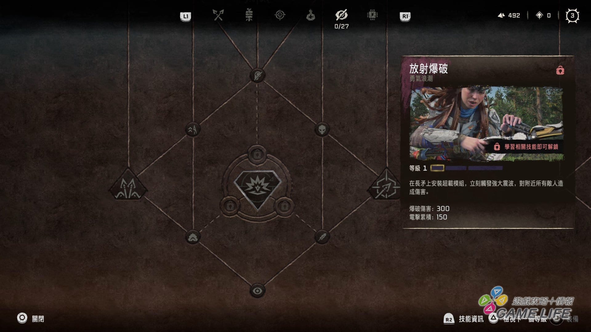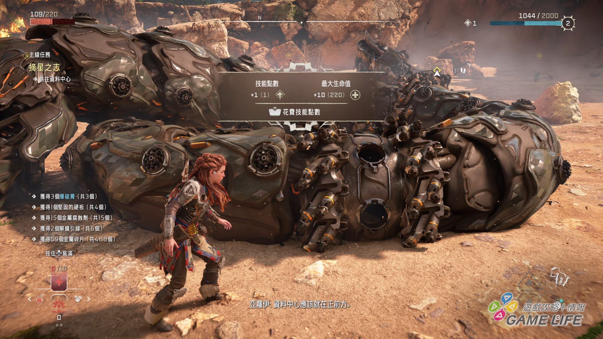 不過這部份,也並非只有敵人變強,玩家扮演的 Aloy 也有一定程度的強化。開放世界動作角色扮演最常出現的成長系統就是隨著等級跟劇情獲得技能點數,並且消耗技能點數去技能樹點選技能,藉此打造與其他玩家不同風格的成長與戰鬥方針,本作當然也是採取這種成長系統,但是,技能點數的獲得相當容易,等級提升、玩小遊戲、解支線劇情都有機會獲得。