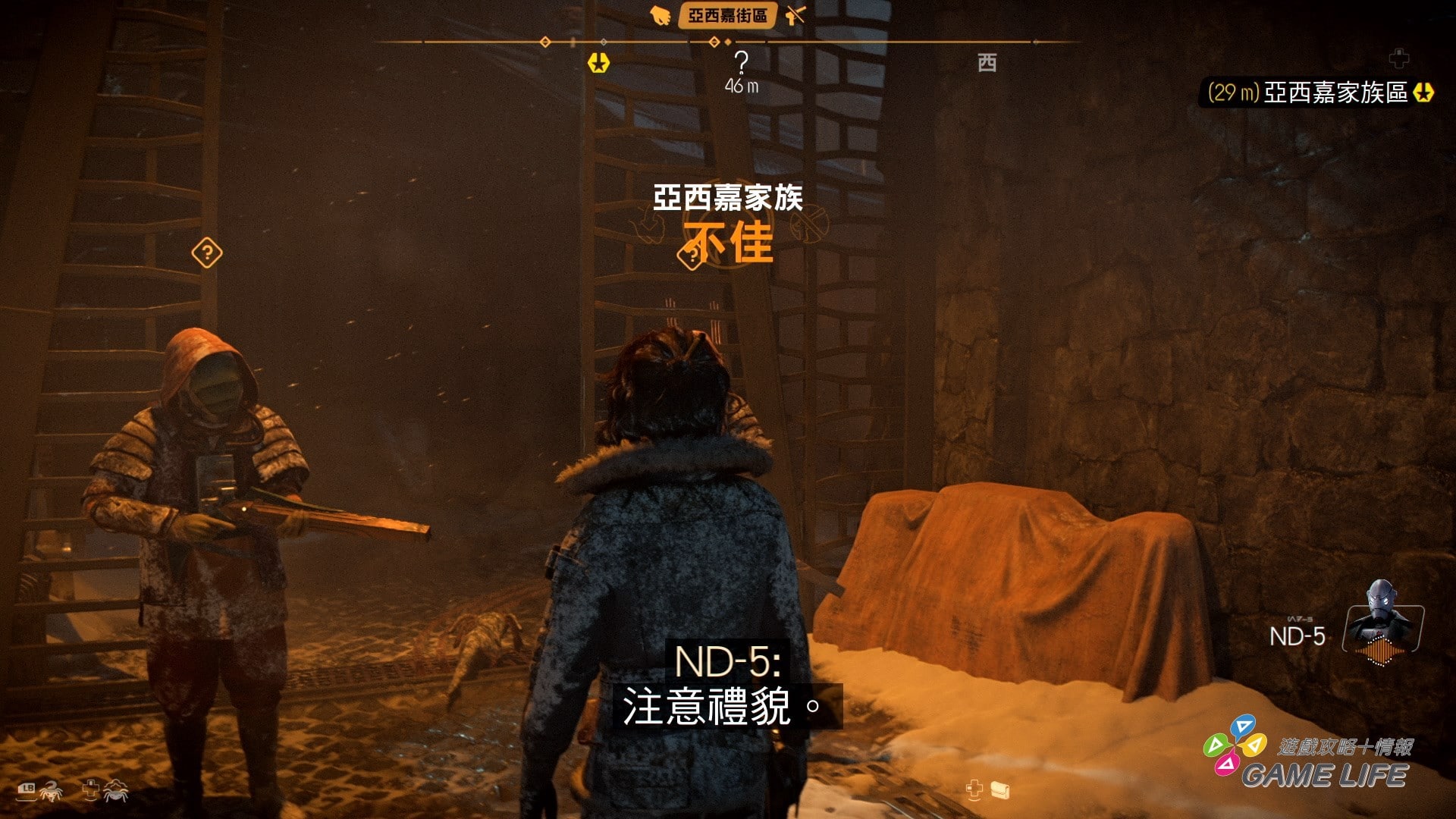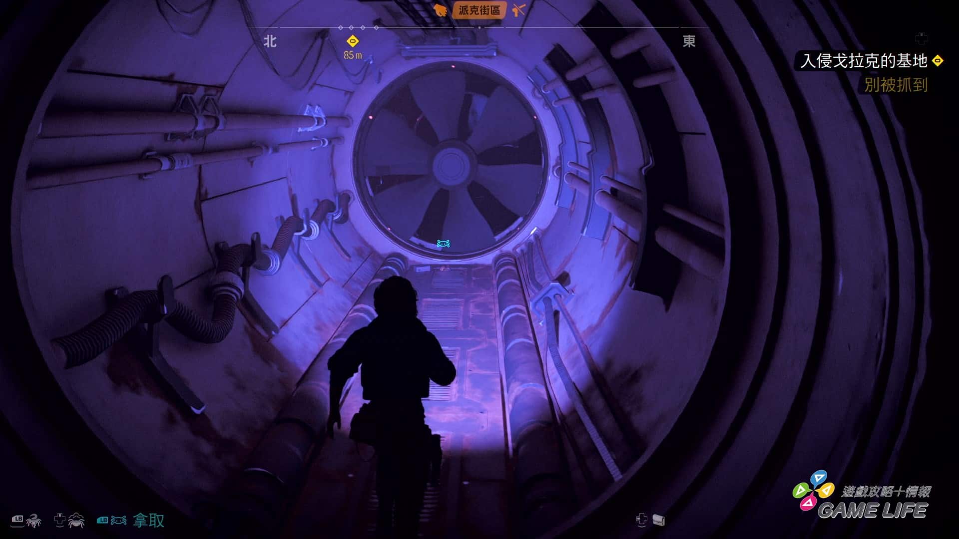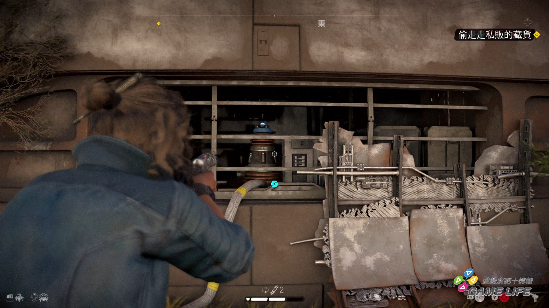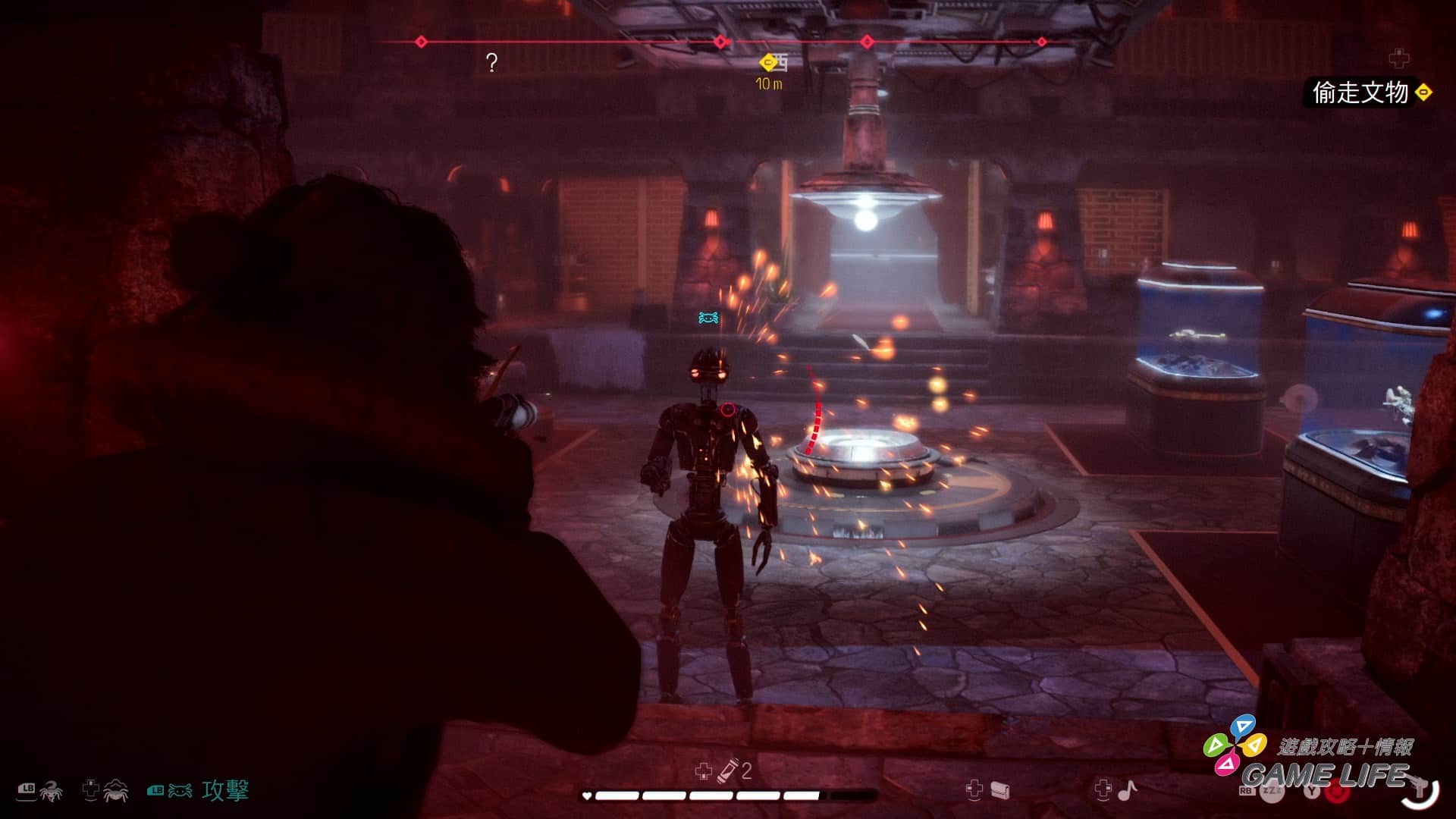 不過潛行任務多半有幾個問題要面對,第一就是路線的規劃跟尋找,本作雖然可以請小尼「掃描」周圍看看狀況,但頂多只能確認是否有巡邏者,可以互動的物件不容易看出,加上可以走的路線或通道標示並不是很明顯,哪裡可以鑽、哪裡可以用勾繩擺盪等等,在找路方面頗容易花上不少時間。倒是如果有小尼可以互動的物件,會蠻好發現的,玩家探索時也可以經常打開指揮小尼的指令找找看能請小尼幫什麼忙。