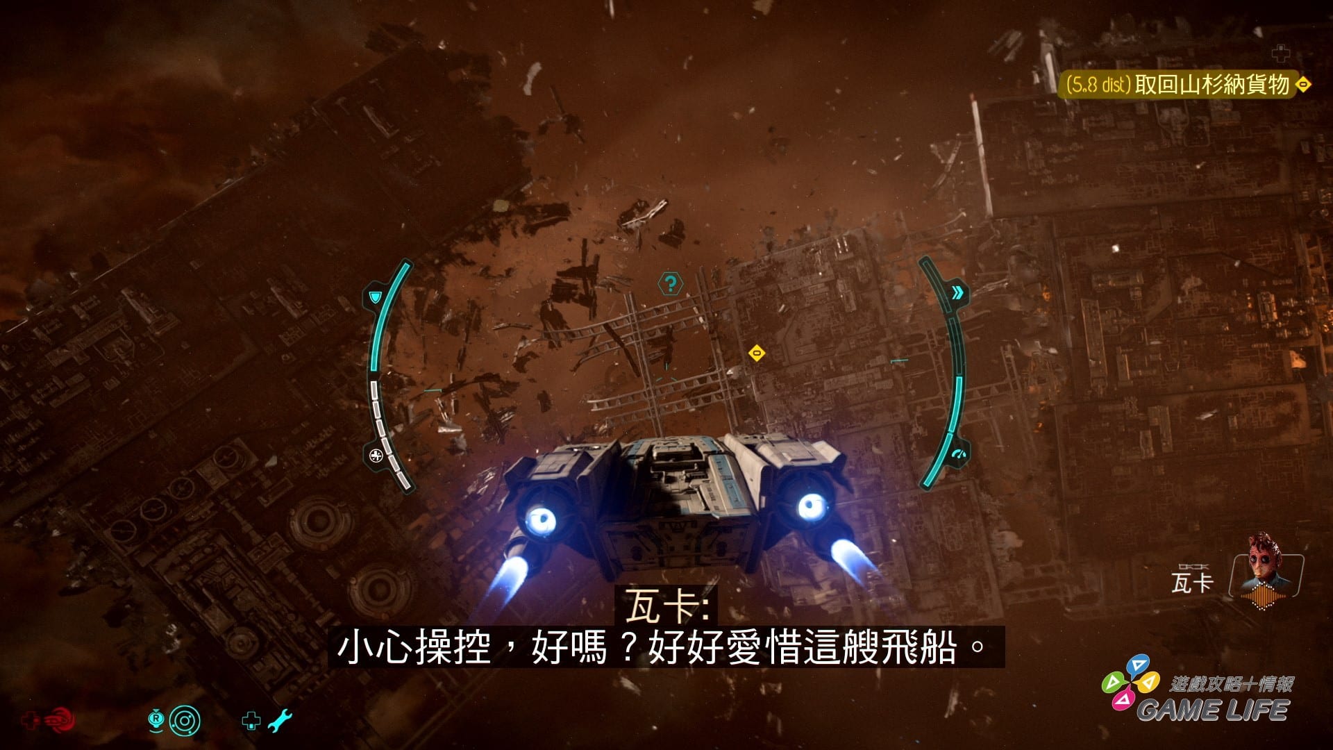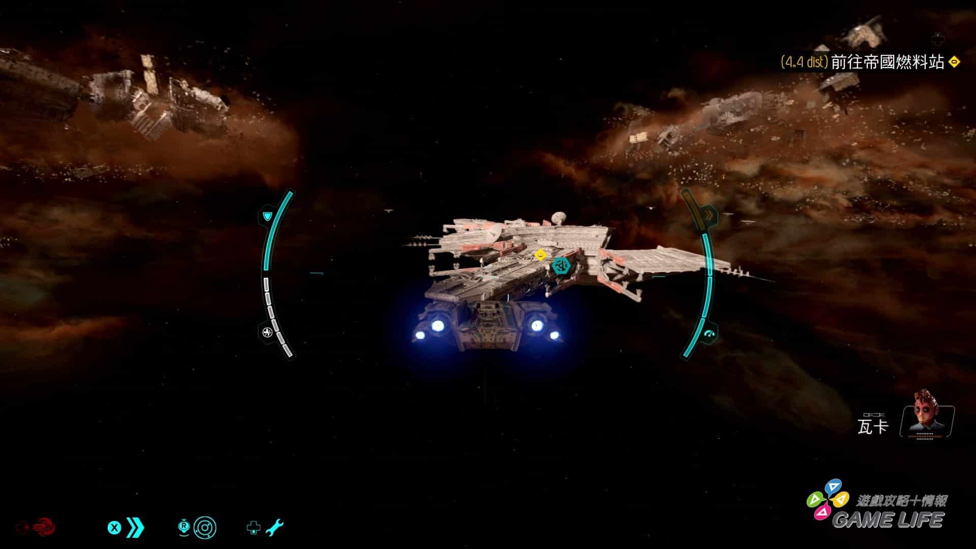 另一個戰鬥要素則是建立在船艦戰,修復自己的船艦後,凱伊可以前往複數個星球展開冒險,當然勢必在移動過程中會遭遇各種船艦戰,有時是遇到強盜打劫、有時是捲入特定兩方幫派間的戰爭。船艦有雷射跟飛彈能進行攻擊,由於太空船艦戰是 360 度全方位飛行下的戰鬥,所以玩家要不斷地用左右類比控制船艦的移動跟鏡頭去瞄準敵人。