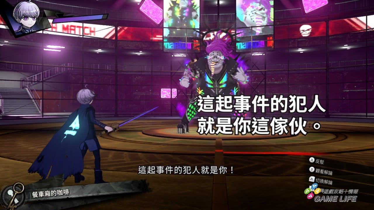 小遊戲的種類有很多,有單純的二選一、也有充滿 QTE 的動畫演出、湊出正確文字的拼字等等,其中最常遇到的就是跟「謎怪人」的對峙。這個系統對玩過《槍彈辯駁》系列的玩家來說應該就相當熟悉了,「謎怪人」會用類似動作遊戲的形式,東扯西扯一堆話語阻礙玩家,但話說多了就一定會產生「矛盾證言」,玩家就要挑選正確的「解鍵」,當成武器去砍破發現矛盾的證言。