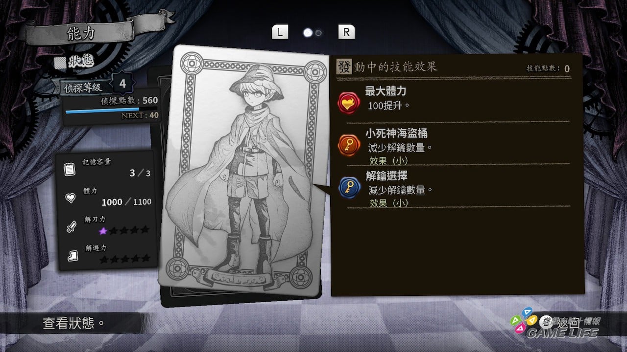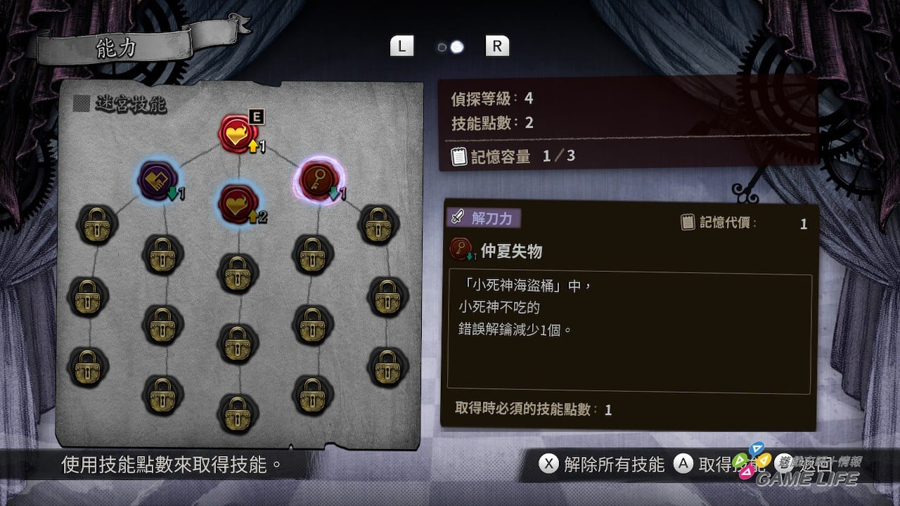 至於為什麼說「謎迷宮」會像角色扮演,那就是遊戲中其實有類似經驗值跟支線任務的存在,過程中會提高幽瑪的偵探等級,還會獲得點數去開放偵探技能,開放的技能會有利於「謎迷宮」的闖關,且要點什麼技能有給玩家一定程度的自由選擇,使整個遊戲有著文字冒險以外的樂趣。