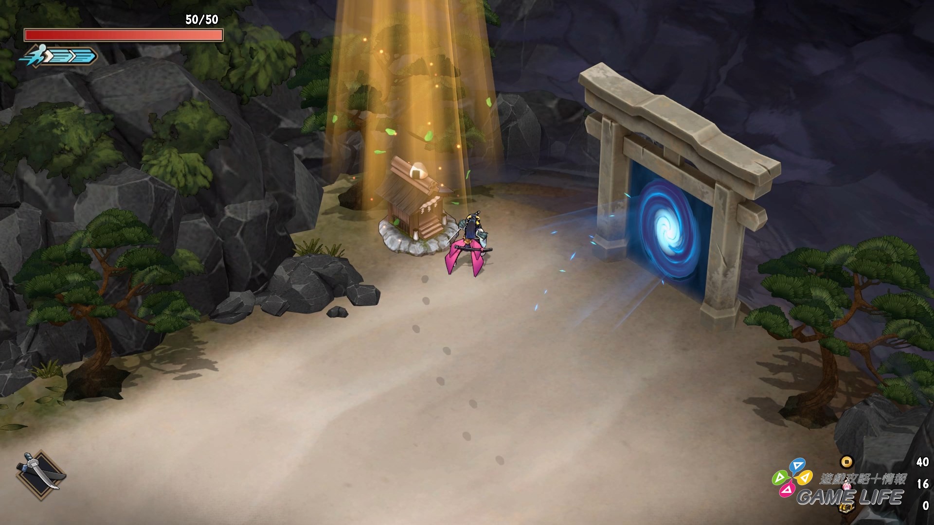 動作部分,採 45 度角俯瞰,以 3D 動作的形式,在限定的空間中打倒空間中所有的敵人來進行。過關時就會獲得寶珠,讓玩家隨機強化自己手持武器的戰力,另外各小關旁還有個小小的參拜處,過關時去調查也會隨機給獎勵,例如回復體力或者改造角色基本性能的護身符。