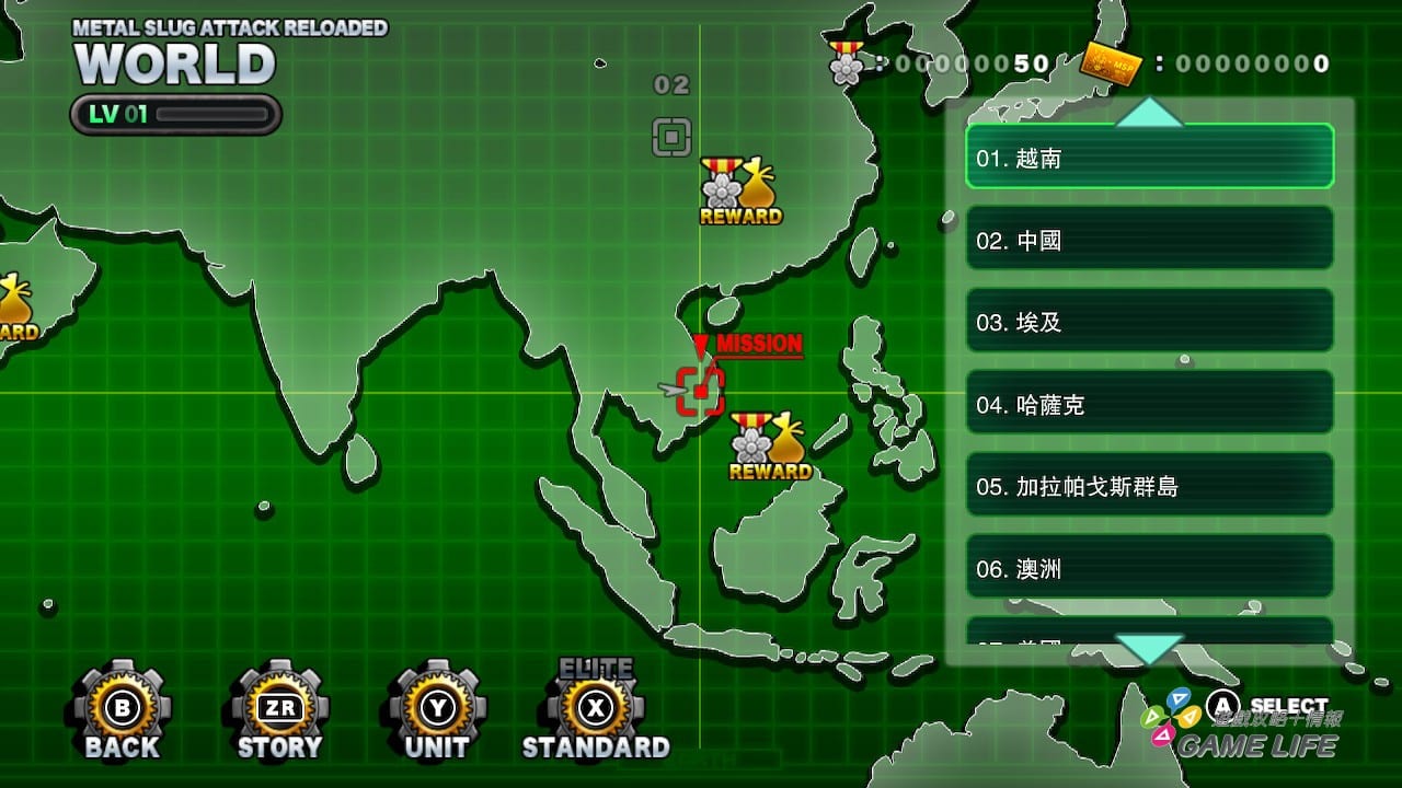 整體遊戲的進展方式就是挑戰世界各地的關卡,救俘虜過關獲取裝備跟資金,當發現關卡過不了時,就回頭調整隊伍編成、強化隊伍成員、整理隊伍裝備,必要時也得透過轉蛋要素獲取新兵種。整個概念完全不是《越南大戰》了,最有《越南大戰》味道的地方大概就是 2D 點陣圖風格、系列登場人物、系列關卡跟系列頭目都會在遊戲中出現吧。