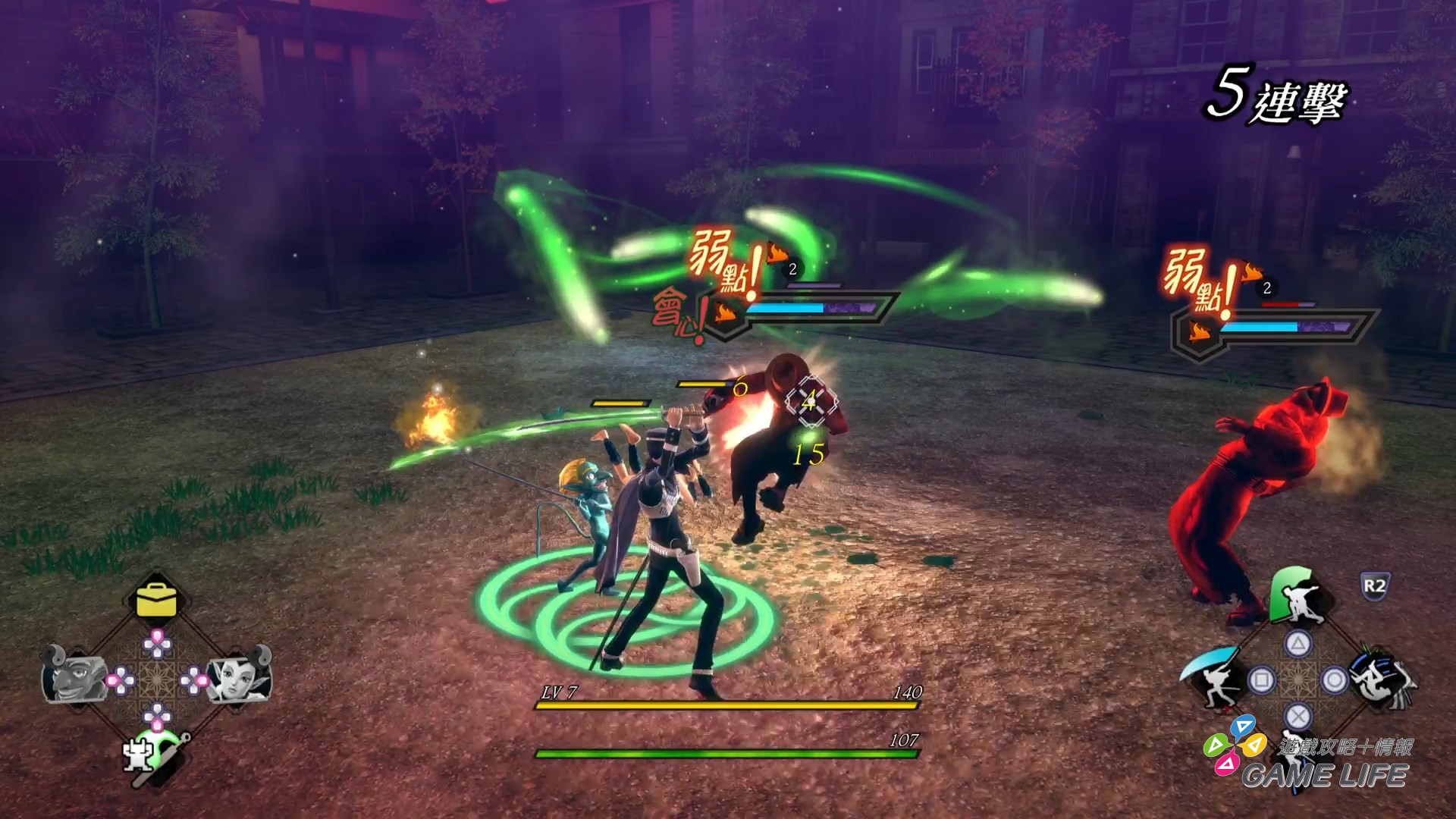 基本動作有輕重攻擊、射擊、迴避、法術、跳躍等等,並且可以召喚兩隻仲魔來協助戰鬥,玩家可以透過指令式選單下令仲魔使用技能,如果嫌麻煩破壞節奏還能使用方向鍵直接下令仲魔的行動。並且可以隨時因應敵我屬性回收仲魔,挑選相剋屬性的仲魔來應戰。