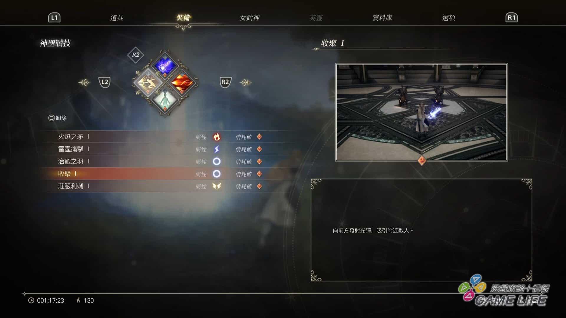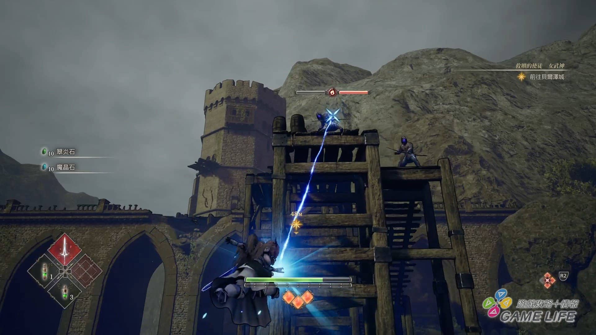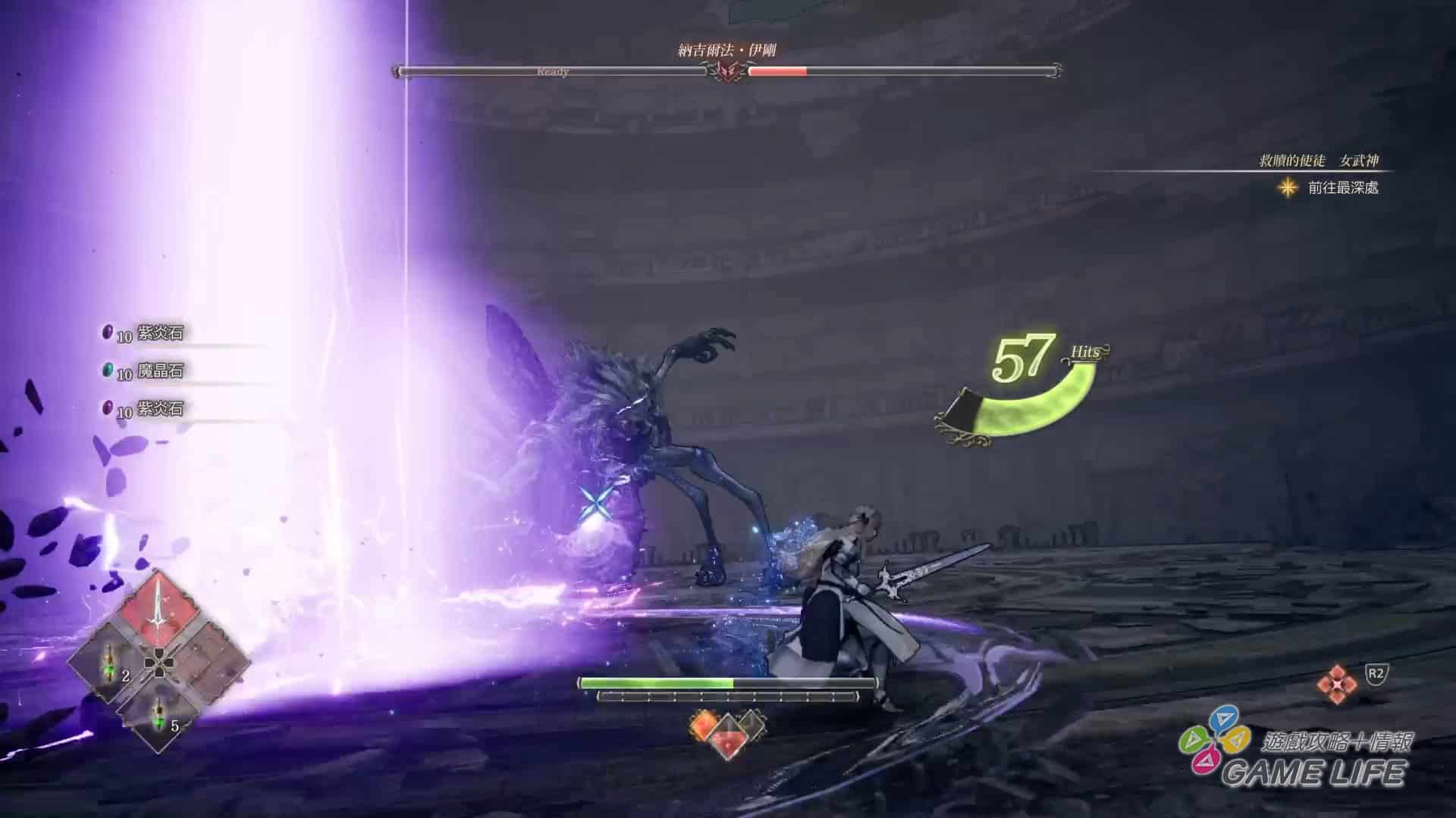 那麼回來談這次遊戲的重點,也就是戰鬥系統吧。本作女武神可以裝備兩種武器、兩種道具、四種技能、四位英靈,並交錯活用來進行戰鬥,當然每一種武器、技能、英靈各自有不同的性能,甚至是屬性。依照剛剛提到的,玩家收集素材可以消耗來強化武器與女武神,強化不光是提升數值,還可以增加新的攻防動作,使自己的戰鬥更具變化性。