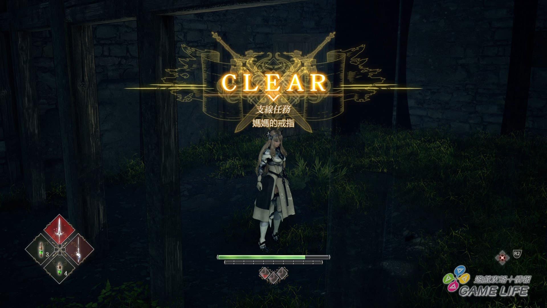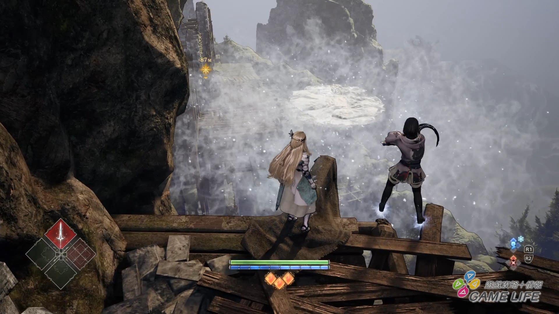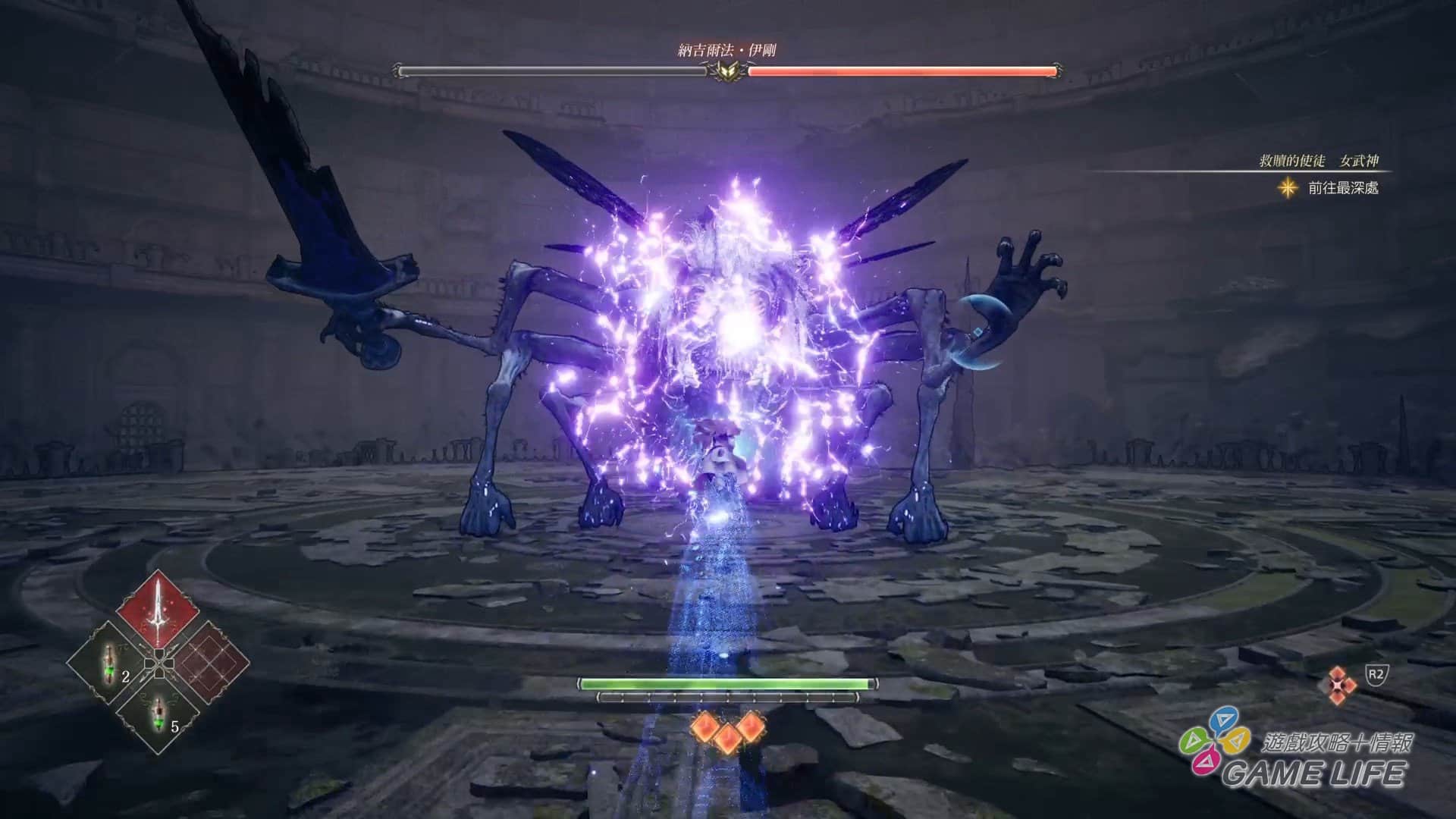 那麼回來談這次遊戲的重點,也就是戰鬥系統吧。本作女武神可以裝備兩種武器、兩種道具、四種技能、四位英靈,並交錯活用來進行戰鬥,當然每一種武器、技能、英靈各自有不同的性能,甚至是屬性。依照剛剛提到的,玩家收集素材可以消耗來強化武器與女武神,強化不光是提升數值,還可以增加新的攻防動作,使自己的戰鬥更具變化性。