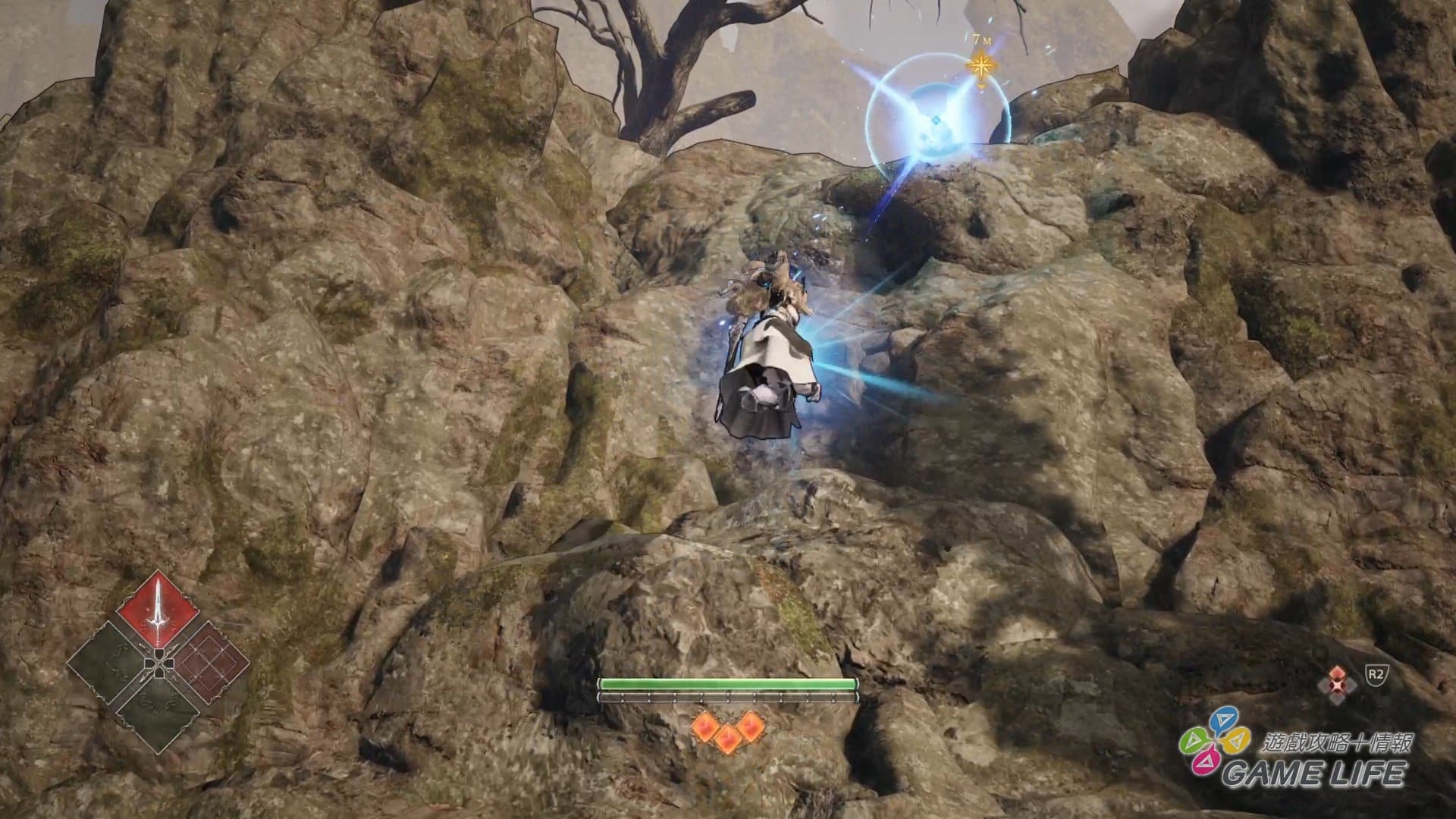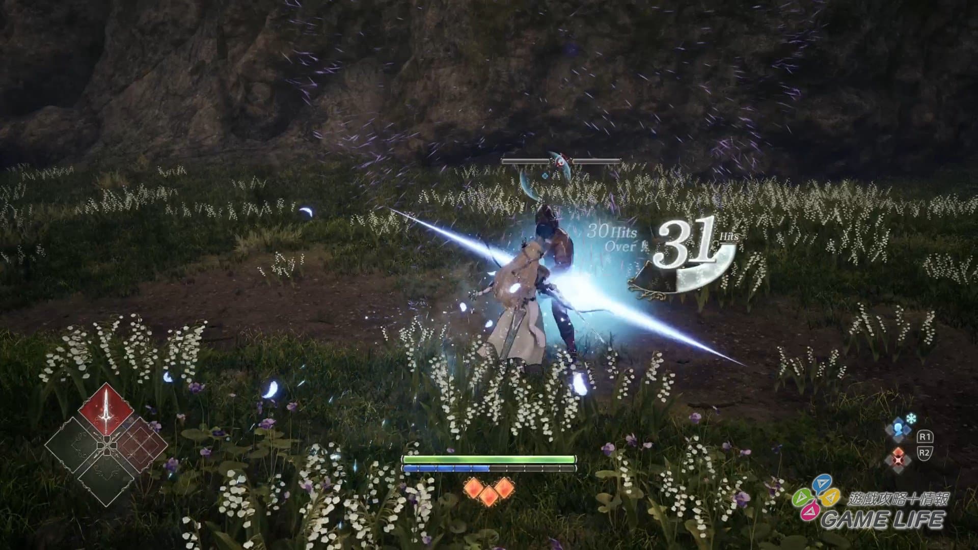 人物動作的基本就是輕重攻擊、防禦、跳躍、迴避這幾種動作的交錯使用。上述用來進行遠距離移動的「Soul Chain」也可以用來勾住敵人將自己拉過去,進而達成攻勢不中斷的動作性。不過構成這遊戲主要戰略性的,還是在英靈跟技能的搭配上。