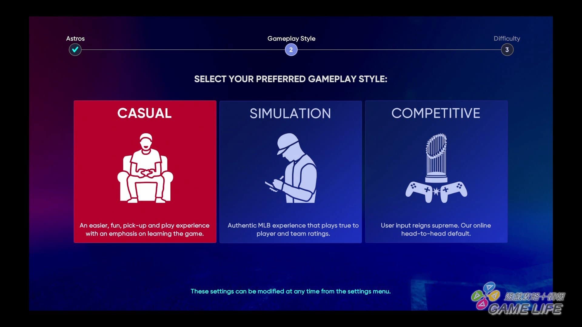 還有另外一個筆者覺得非常值得讚賞的地方,就是操作模式的多樣化,遊戲一開始會請玩家設定遊戲難度跟想要用怎樣的操作模式來進行遊戲。有接近現實投球跟揮棒的操作、也有只要按按鈕就可以簡單揮棒跟傳球向目標的操作方式,甚至覺得要即時判斷傳球方向太過困難的話還可以選擇交由電腦判斷等等。