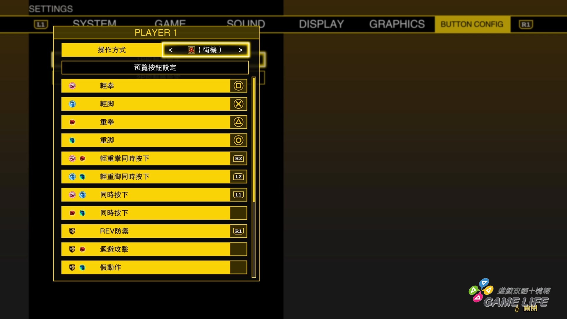 遊戲主要有五顆按鈕,傳統操作時是輕重拳腳四種跟一顆特殊鈕;簡易操作則是拳腳、指令技按鈕、簡易連段按鈕跟特殊鈕。由於不管哪種操作,本作的系統設計上都經常需要複合按鈕,所以筆者頗建議比起家用主機手把,大型電玩搖桿或 Hit Box 來玩這款遊戲會比較方便。