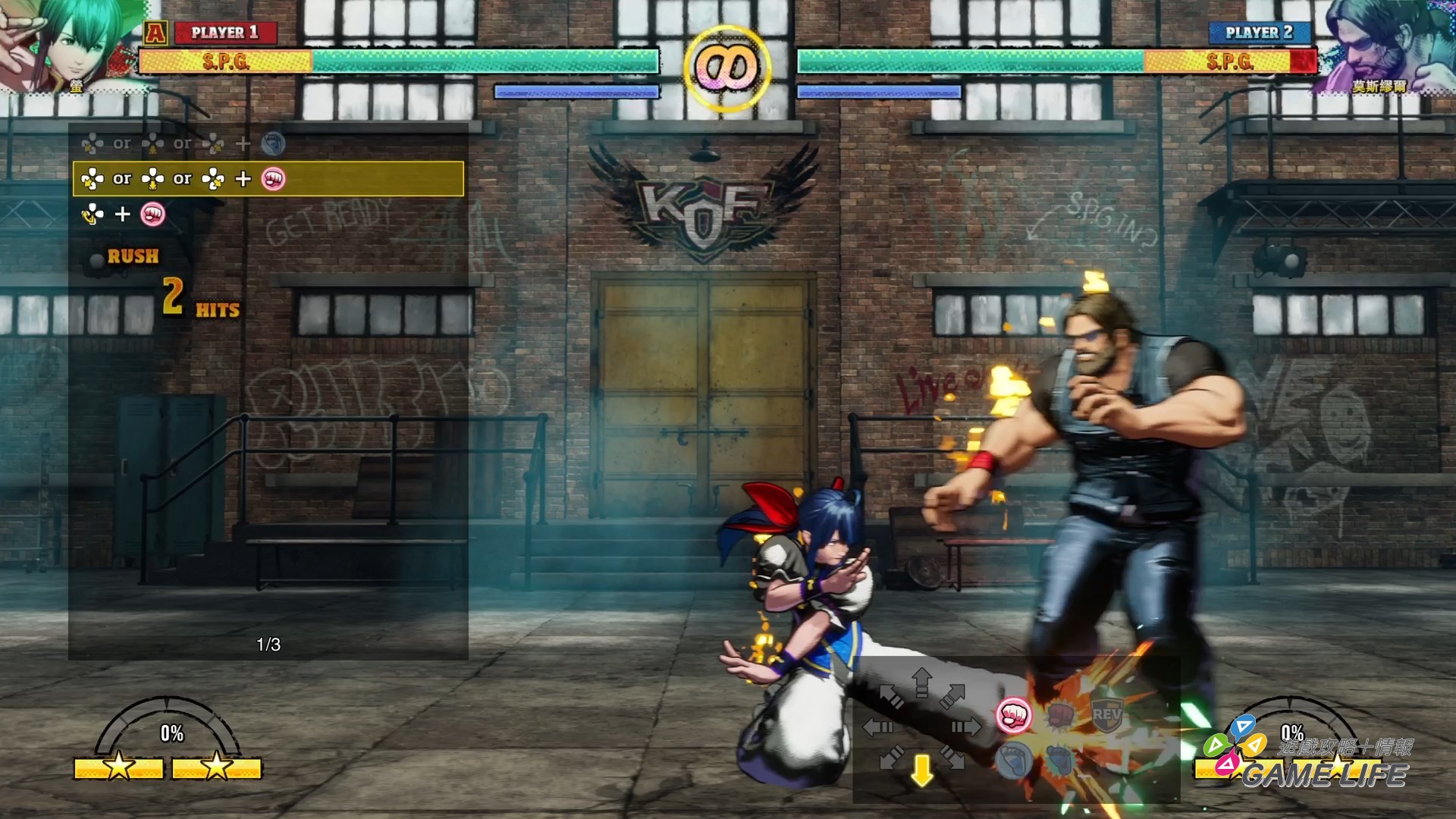 REV 計量表主要會因為兩種行動累積,在 S.P.G. 狀態下特定兩顆鈕一起按,不論地上都是空中皆能發動的強力攻擊,REV 攻擊。REV 攻擊以綠色光芒呈現,能夠硬扛敵人的部分攻擊出手。本作的簡易連段系統,多半是特定按鈕連著按成立簡單的拳腳連續攻擊(因應角色不同按鈕也不同),然後多半可以用 REV 攻擊收尾,當然也能不用 REV 攻擊改用特定指令技,這部份就關係到本作的連段概念,後面再說。