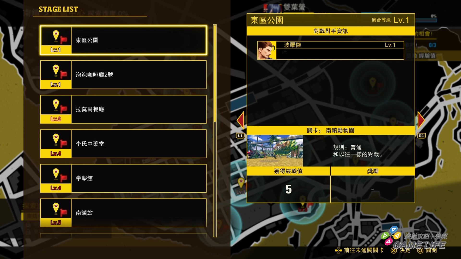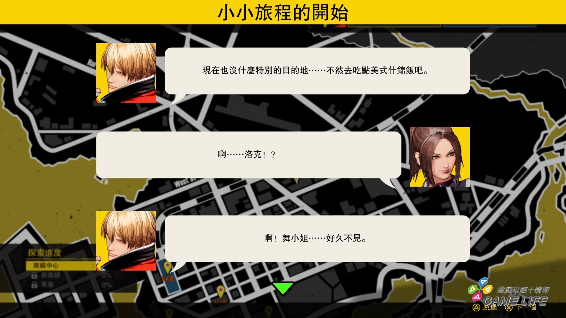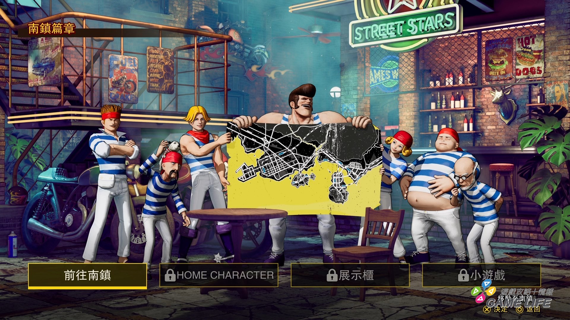 後者則算是有添加點探索加角色扮演的遊戲要素,玩家挑選的角色探索《餓狼傳說》系列的關鍵舞台「南鎮」,前往各個地點觸發劇情或開啟收集要素,過程中會遇到各種等級的敵人跟特殊戰鬥規則,打倒他們會提升等級,強化選擇角色的基本能力,跟 Arcade 相比,會是比較花時間的遊戲模式。
