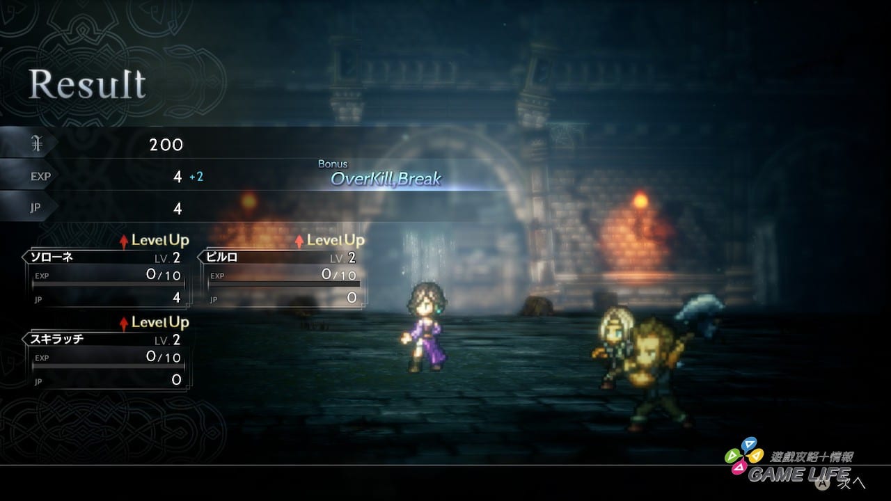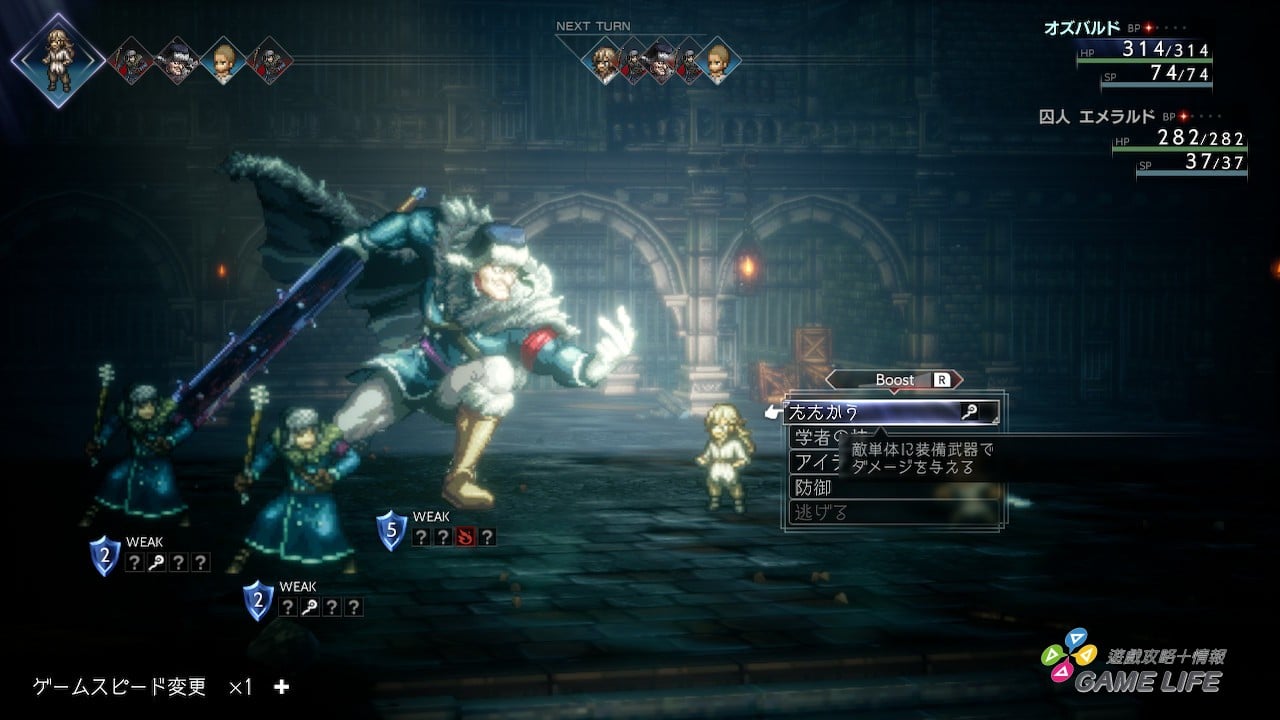 《歧路旅人》時這個系統如果用得好,是能讓頭目級的敵人連動都不能動就被擊潰,不過這回就無法這麼做了。玩過前作的玩家應該在本作第一章就會發現,本作戰鬥頭目戰難度提高不少。原因主要有幾個,一個是過去敵我雙方的行動順序是看角色的「速度」素質,除非前一回合防禦沒行動,就可以讓下回合先動,但這回就是被 Break 的敵人解除 Break 的那一回合一定第一個行動,所以玩家多數時候無法迴避頭目 Break 結束後的反擊。