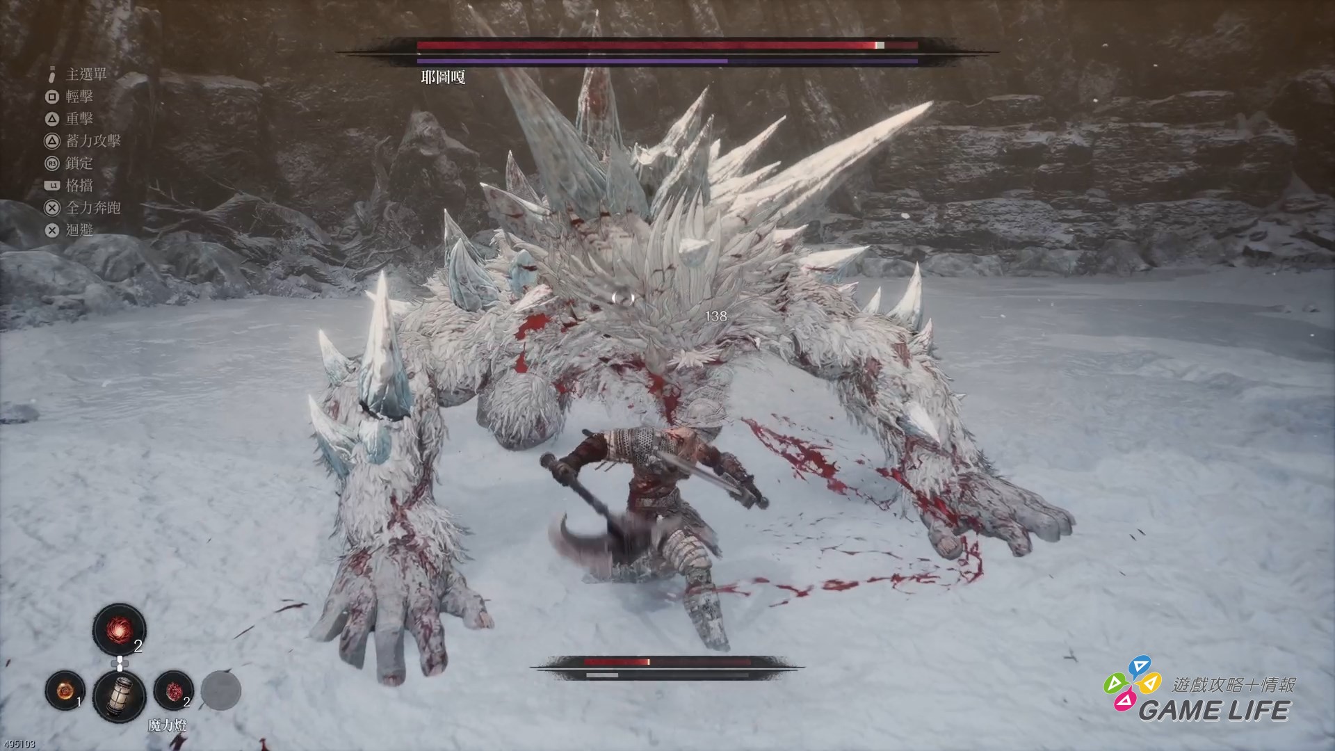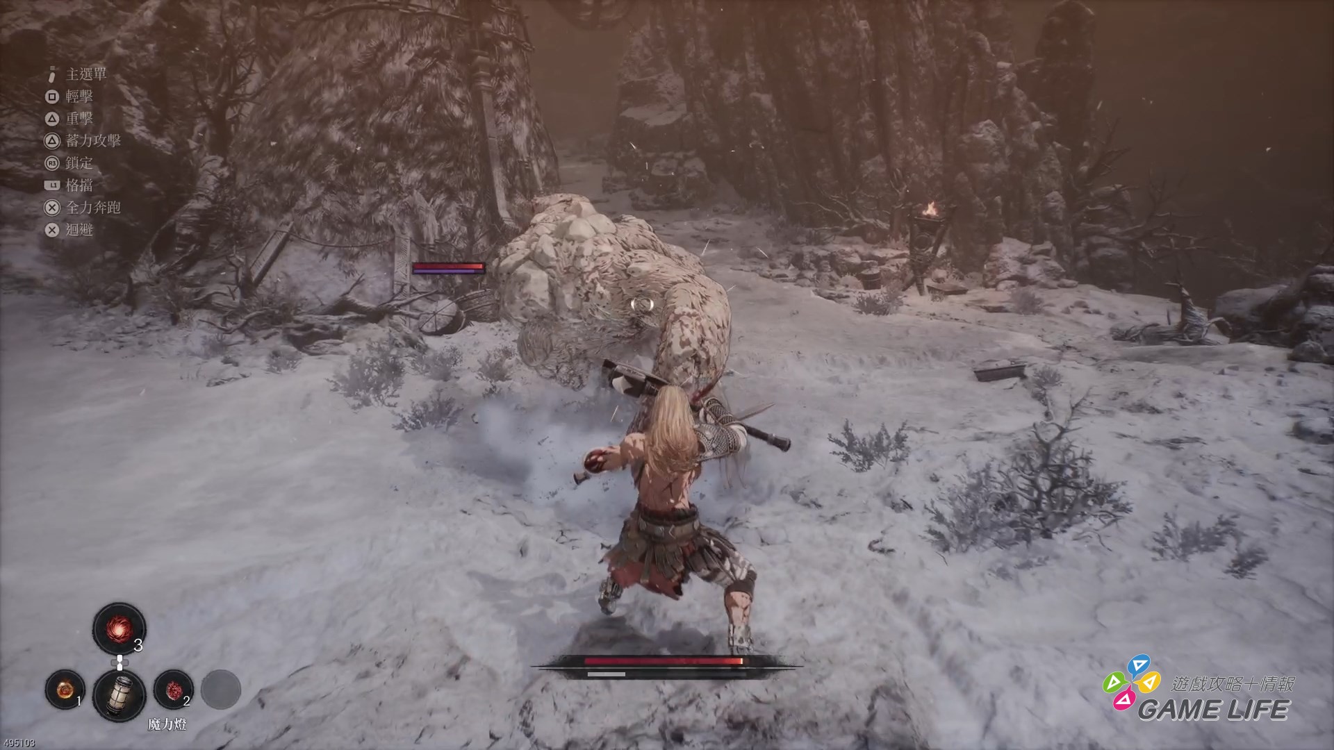 比照同類型遊戲,本作的計量表控管也是體力跟氣力兩種,不論敵我,體力歸 0 就戰死,然後除了走路以外所有的動作都會消耗氣力,氣力歸 0 就會露出大破綻挨揍,所以攻防上的氣力控管相當重要。因此這遊戲動作概念上,就設計出相當重要的防禦系統。簡言之就是攻擊快命中時才按防禦的「格擋」概念,格擋成功的話防禦不會消耗氣力,還能削減敵人的氣力,是要多多觸發的關鍵系統,但也因此提升了這遊戲不少難度,這點容後在述。