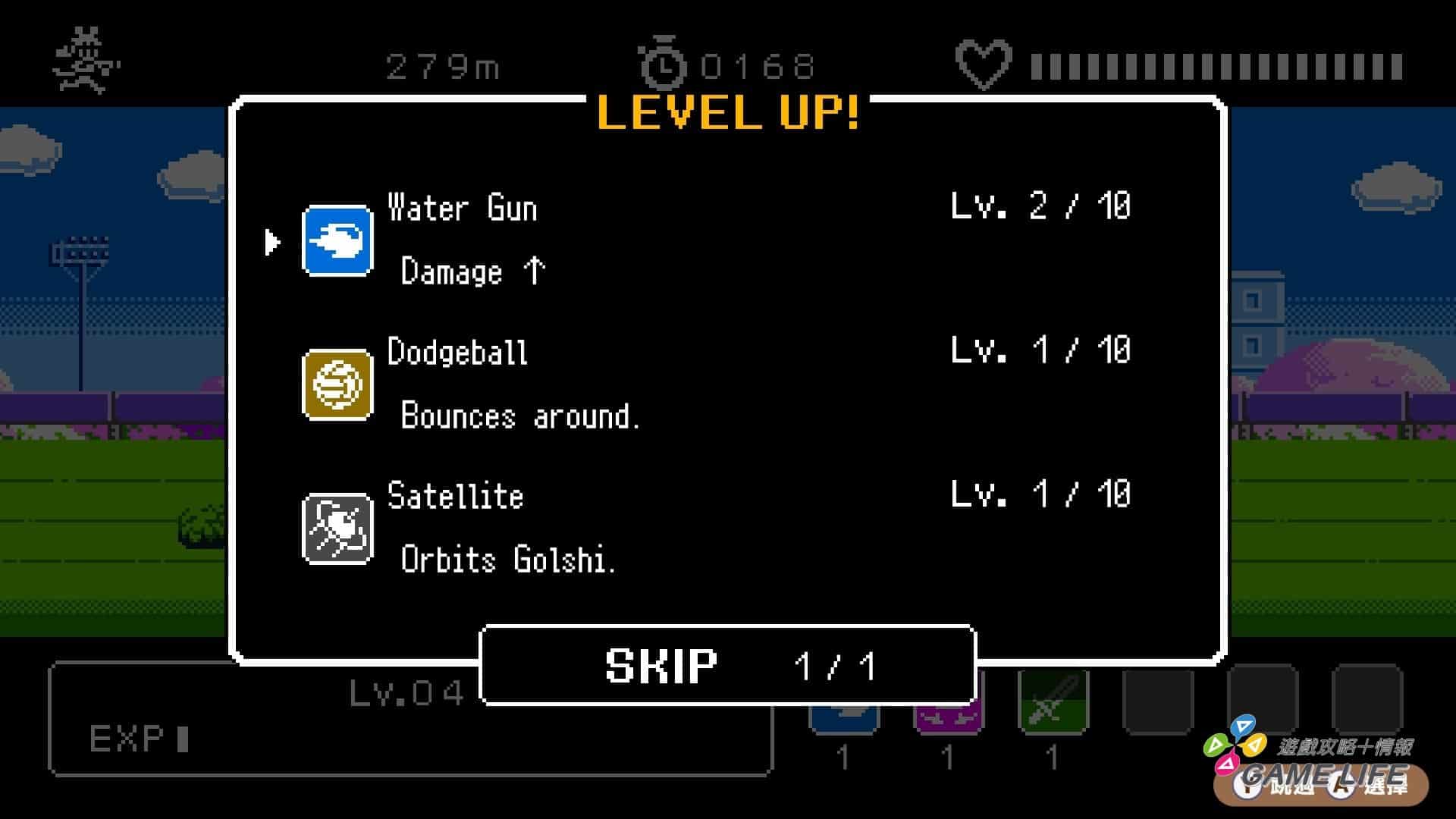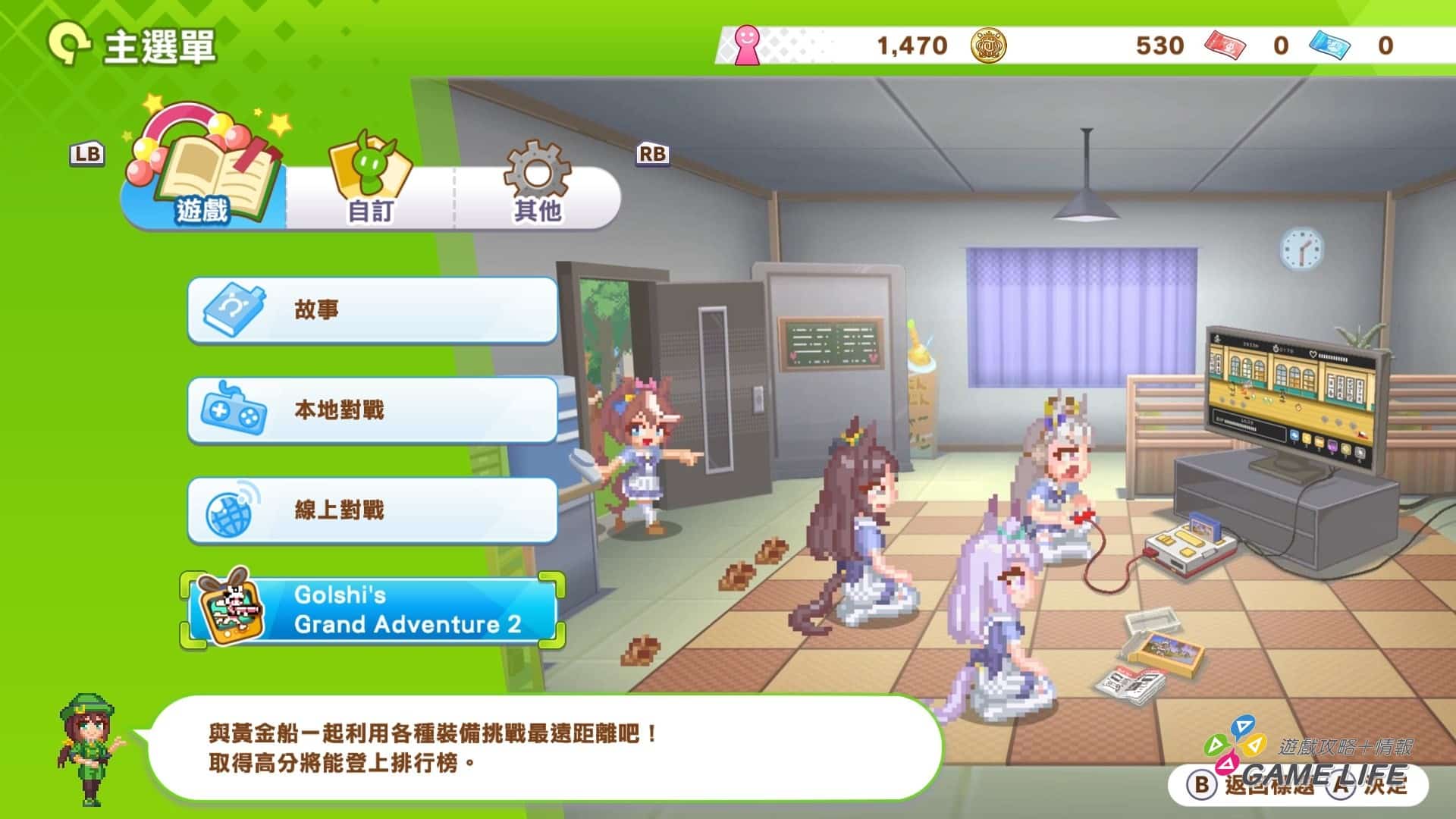 至於最後一項小遊戲「黃金船大冒險」,是一款橫向捲軸動作遊戲,遊戲以任天堂的風格呈現的單人類《Vampire Survivors》概念的遊戲。這遊戲一個要注意的小地方是,《賽馬娘 Pretty Derby 熱血喧鬧大感謝祭》本身雖然支援繁體中文,「黃金船大冒險」的語系僅英文與日文,用繁體中文介面遊玩的話是強制英文介面。