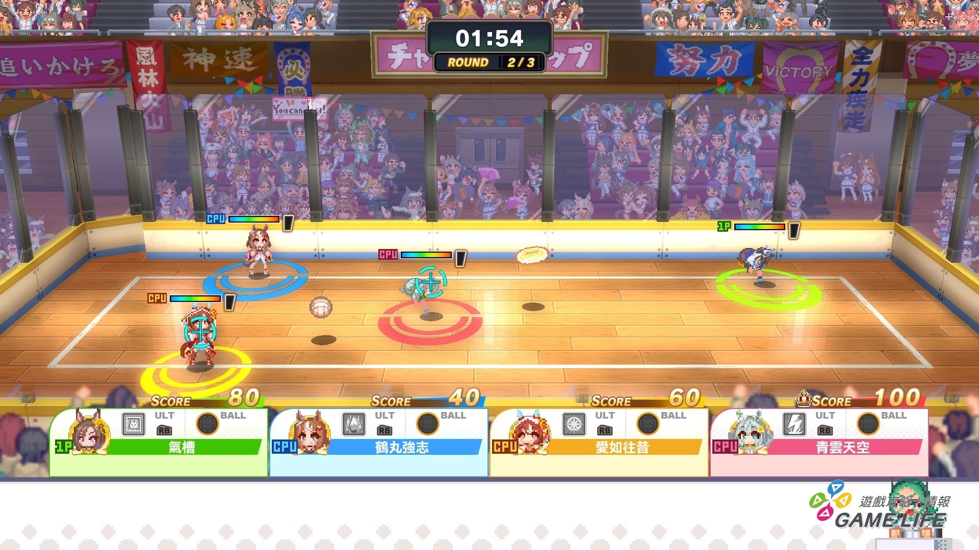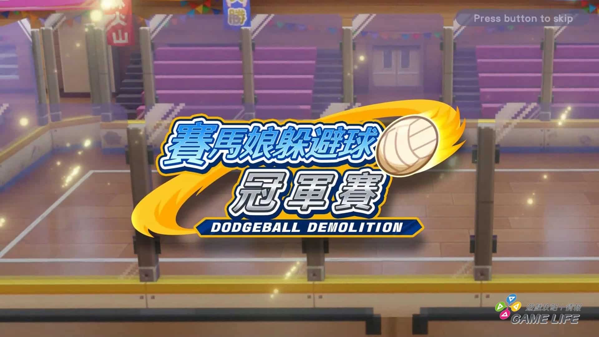 再來要介紹的是「躲避球」,這有點 BR 性質,4 名馬娘在球場上撿球,然後找對象砸,被砸到體力歸 0 的馬娘退場,直到最後場上剩下一人為止。由於比賽進展到最後球會變複數或者是出現巨大躲避球等等,因此打到都會演變成相當刺激,要留意四周的大混戰。