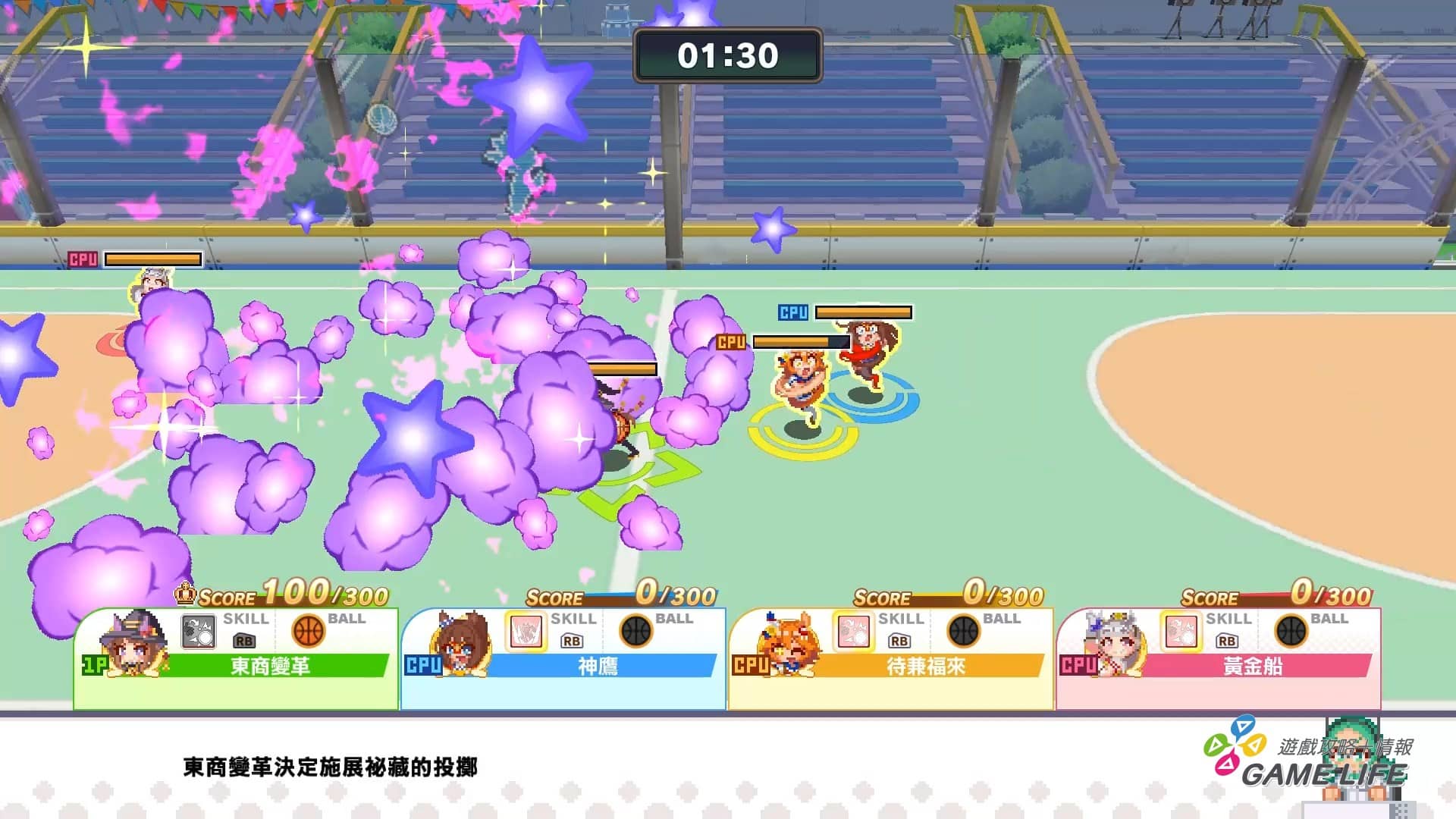 多數玩家跟著劇情最先體驗到的應該就是「籃球」項目,4 名選手在場上爭奪一顆籃球,並將球投入籃框中得分,在限制時間內比誰得到最多分。基本概念是籃球,不過也沒有要求相當嚴謹的籃球規則,玩家角色也是可以帶著球回頭或跳躍等等。而籃球最重要的自然就是跟其他玩家間的爭奪。