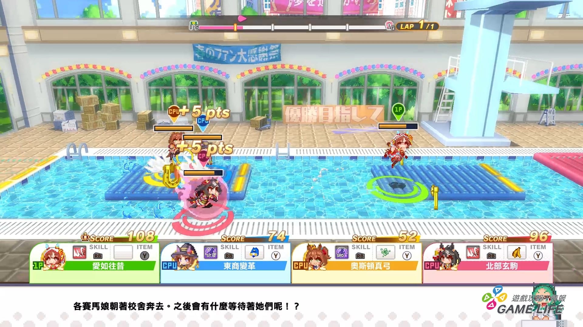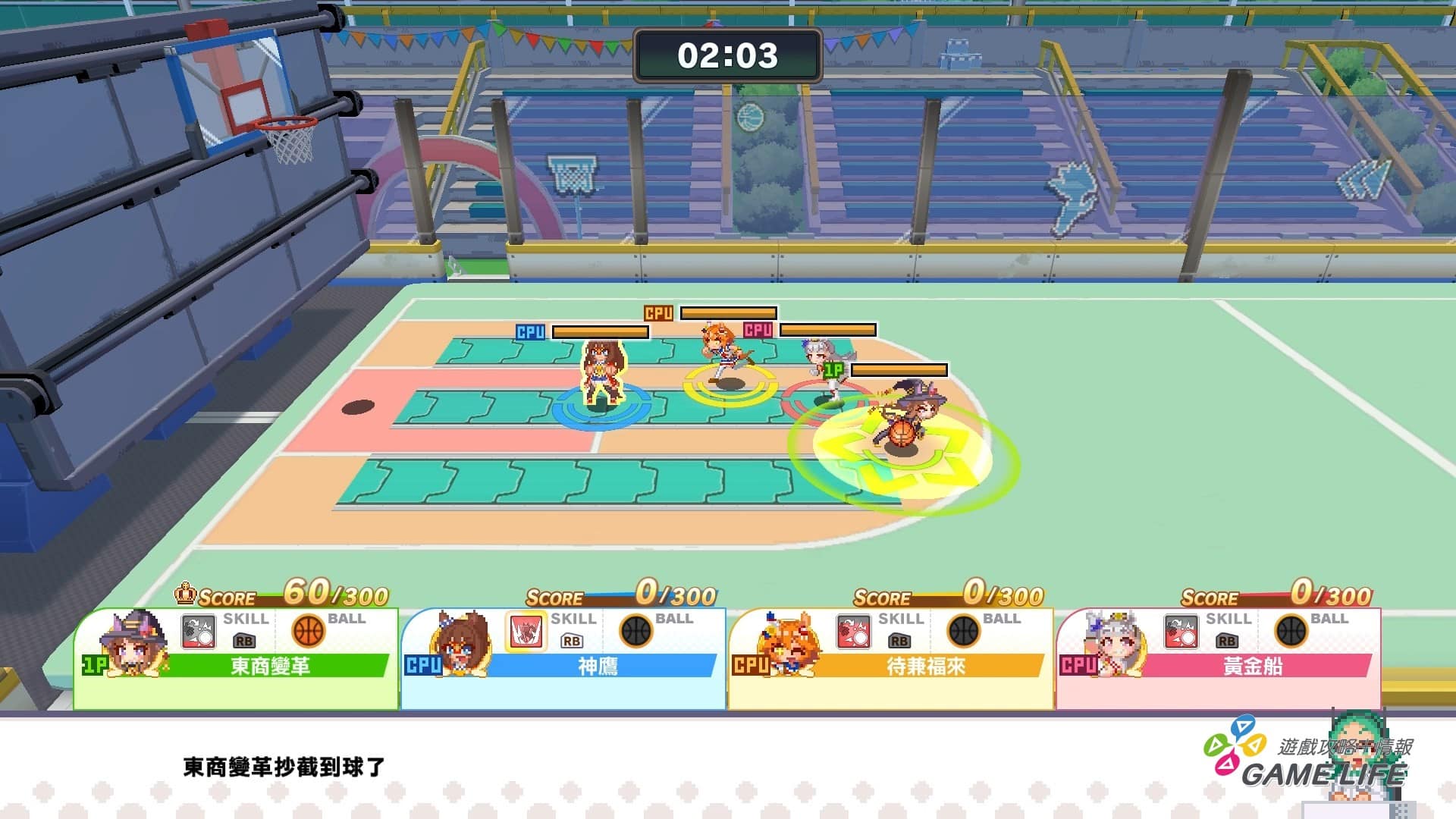 這遊戲所有項目都是 4 人亂鬥,所以大家都會互扯後腿互相爭奪,玩家可以消耗體力去閃避、搶球,猜測對手什麼時候出手、各自的體力消耗要如何調整,就是這項目的周旋重點。隨著遊戲進展會累積「必殺技計量表」,各馬娘也都有自己獨特的絕招可以消耗計量表來使用,並藉此妨礙對手。