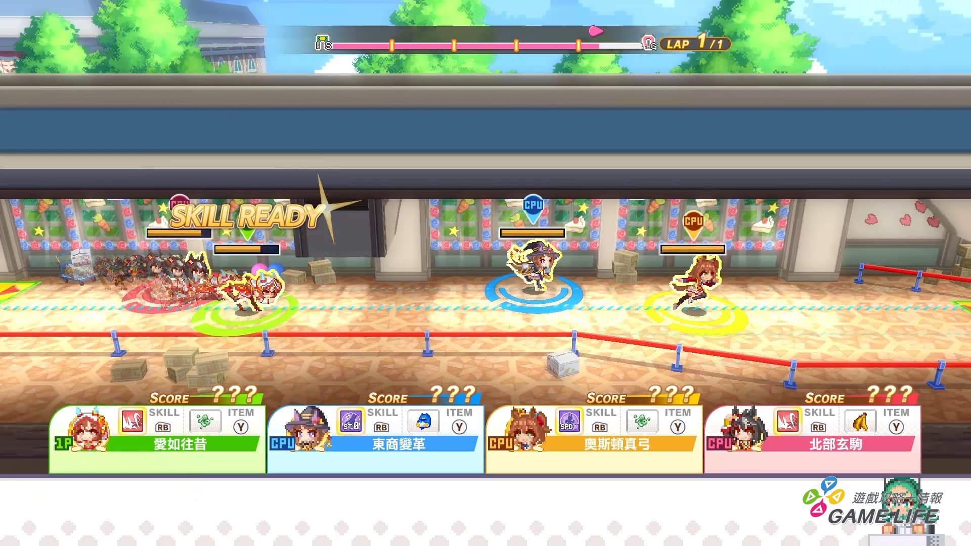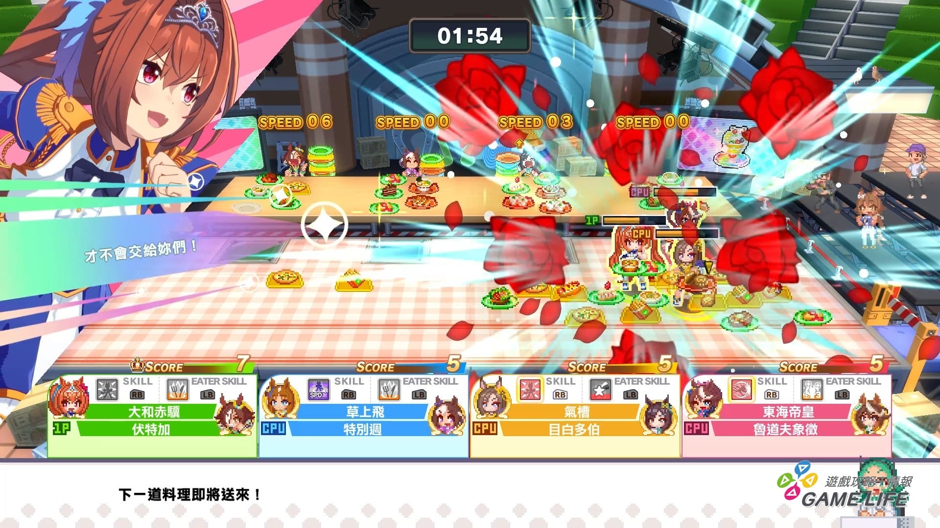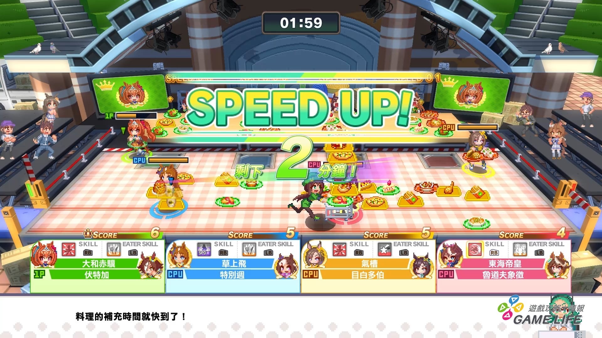 所以就變成運送者有自己的戰略考量,更不用說還有跟任何顏色都能形成 Combo 的彩色盤子,以及運送者也是有必殺技可以妨礙其他參賽者的運送,玩家除了要觀察自己的隊伍的飲食狀況外,還要注意對手的計畫判斷是否要出招阻擾,配合馬娘幾乎都是大胃王的設定,算是頗為有原作色彩的項目。