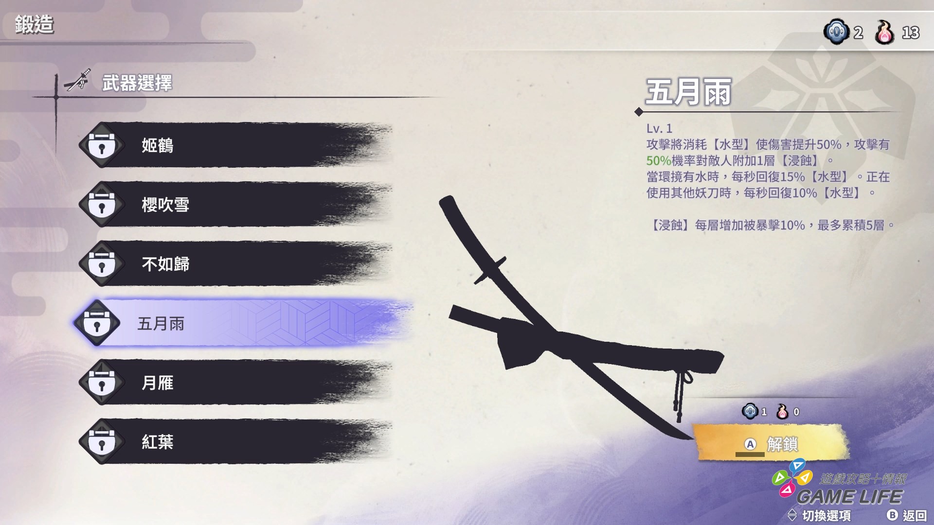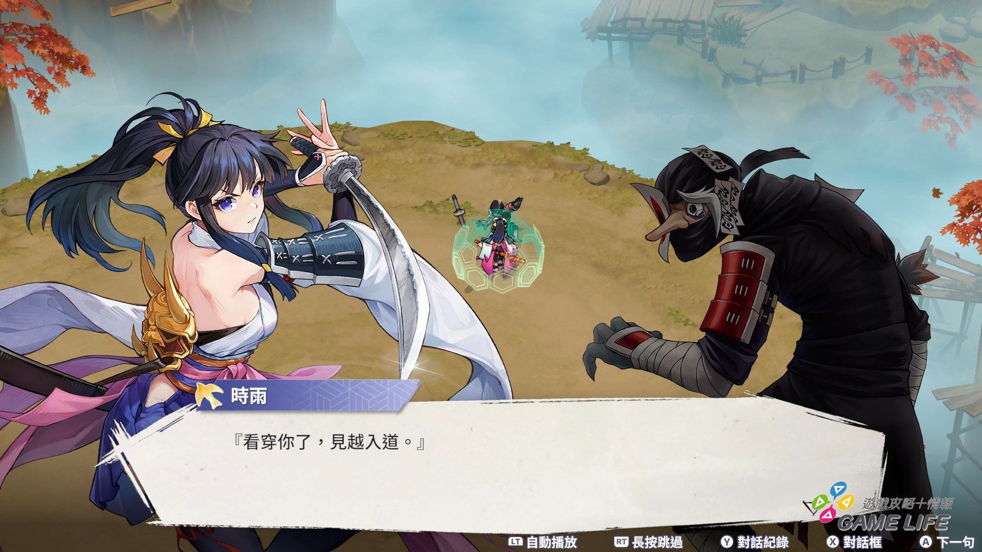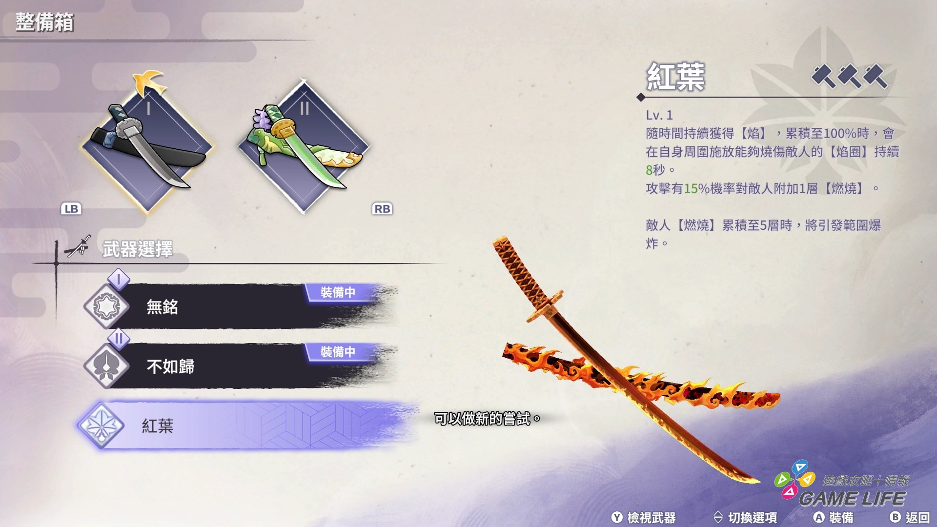 要留意的是三個主角對於武器的裝備方式也都各有不同,這也是一種搭配哲學。例如「時雨」是一刀流,兩把武器是要「切換」使用,所以培養方針就可以針對切換武器時獲得一時的強化效果或者兩把武器因應狀況設定不同定位;相對的「沙羅」是短刀二刀流,她不會切換武器,而是兩手各裝備一把短刀,玩家可以兩手裝備不同武器享受兩種功能、也能裝備同樣武器將一種武器效果精益求精。隨著選擇主角的不同,玩家在武器搭配跟動作性的邏輯上也會不同,動作面就會有三種主角三種樂趣的成分了。