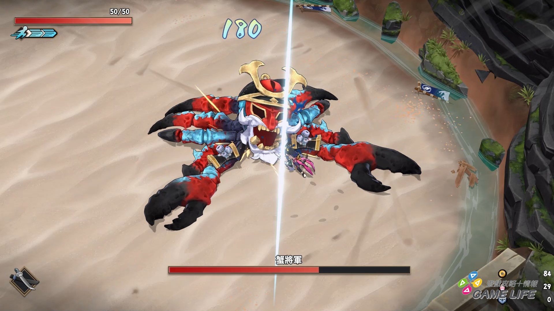 筆者對這遊戲留下好印象的原因,就是因為戰鬥的手感跟爽快感,這點要達成意外地在同類型中,能兩者都及格的作品並不多。本作動作流暢度跟打擊手感相當優秀,每一下攻擊特效反應出的手感相當明確,同時又能隨時反應去取消成迴避衝刺的動作,如果無法衝刺或武器效果結束時,也會明確地用音效或文字特效來提示玩家,可說是相當親切。再加上兩種反擊動作能明確地中斷頭目的強力招式,並用帥氣的動作演出傳達爽快感,整個遊戲就給人一種節奏迅速且痛快華麗的手感。
