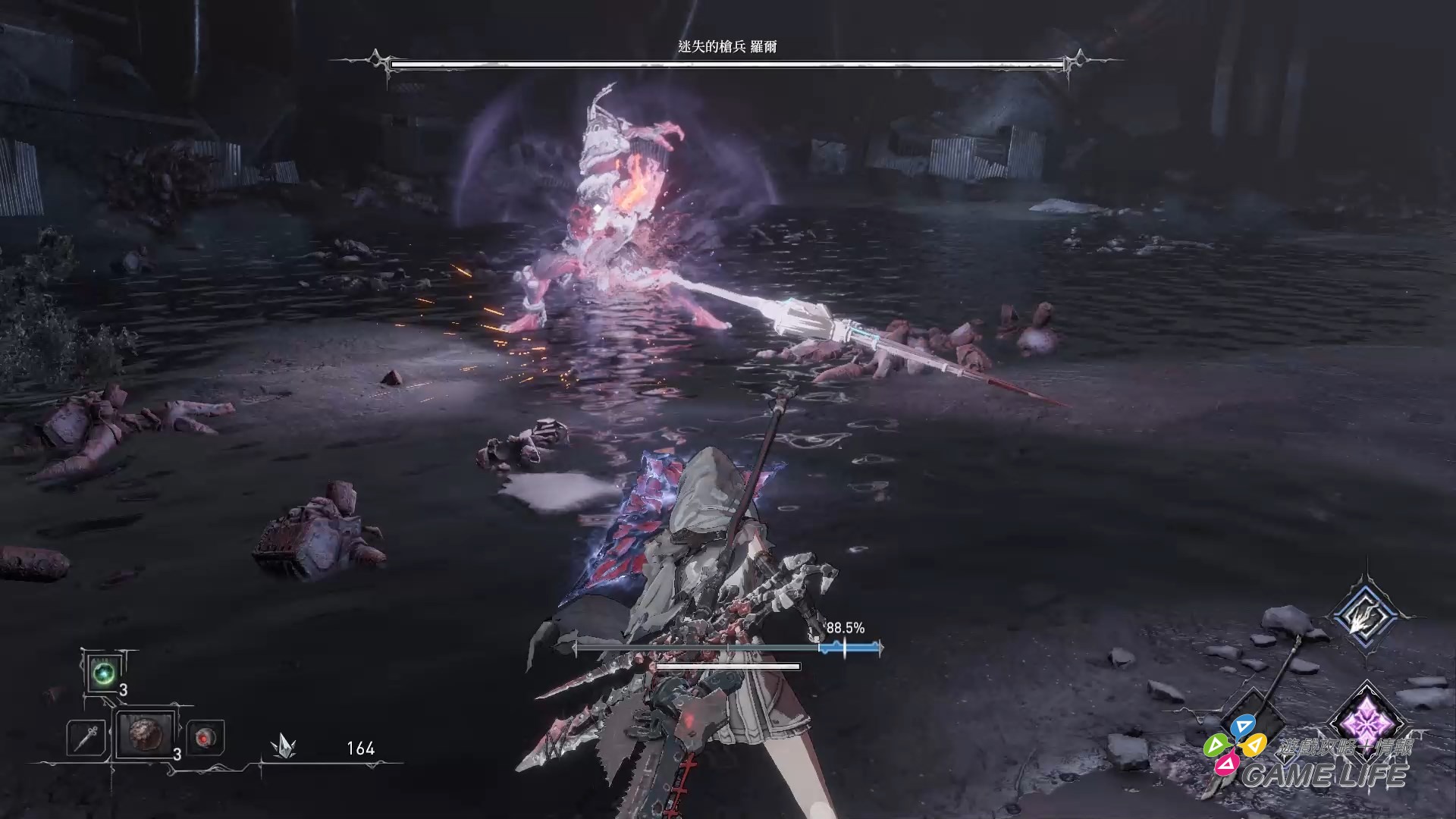 不過既然這遊戲是動作角色扮演,勢必要來探討一下動作系統的設計。《黑暗靈魂》系遊戲的動作系統通常麻煩的地方是除了體力、魔力外還有精力這個數值,所有動作都要消耗精力導致攻守都必須去衡量這個數值的消耗,不能盡情猛攻也不能專注防守,但本作並沒有這個精力設定,玩家戰鬥上算是相當有利且低壓力。