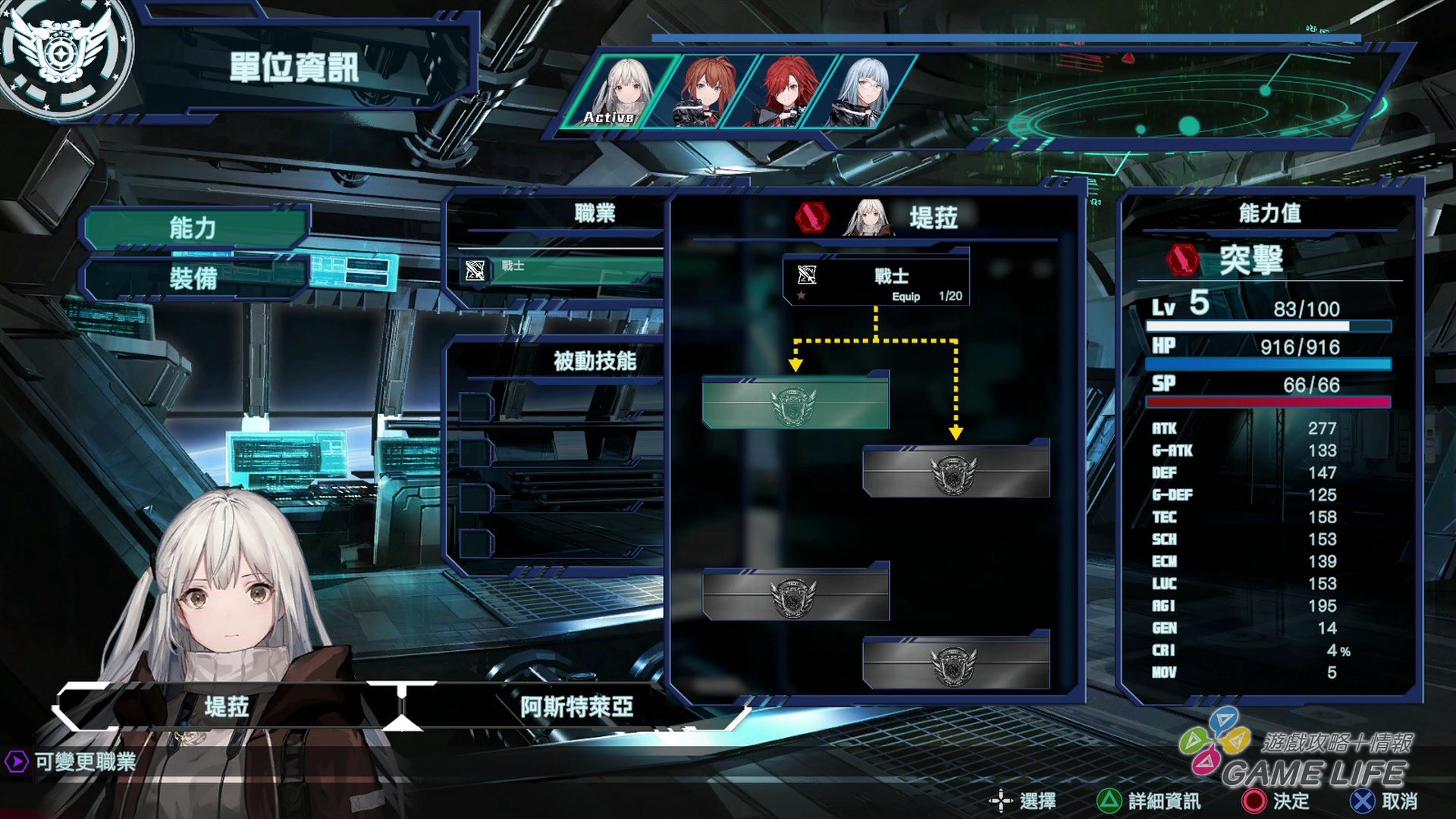 除了戰略部份,遊戲也有相當份量的養成環節。首先劇中角色主要分為四種職業,有人專精衝鋒、有人專精防守、有人專精狙擊,她們的職業性能就反應在她們的機體上,玩家在關卡與關卡間可以改造武器或更換機體的武裝外,最重要的就是技能星盤。各角色在戰場上戰鬥都會獲得點數,消耗點數可以開啟星盤的主、被動技能,進而令駕駛員能力成長。星盤開啟到某種程度還可以轉職,追求更進一步的性能,這也是值得研究與遊玩的要素。