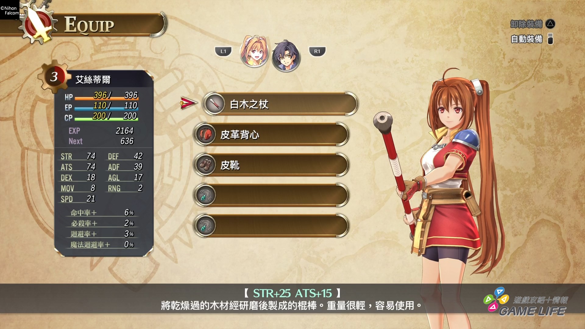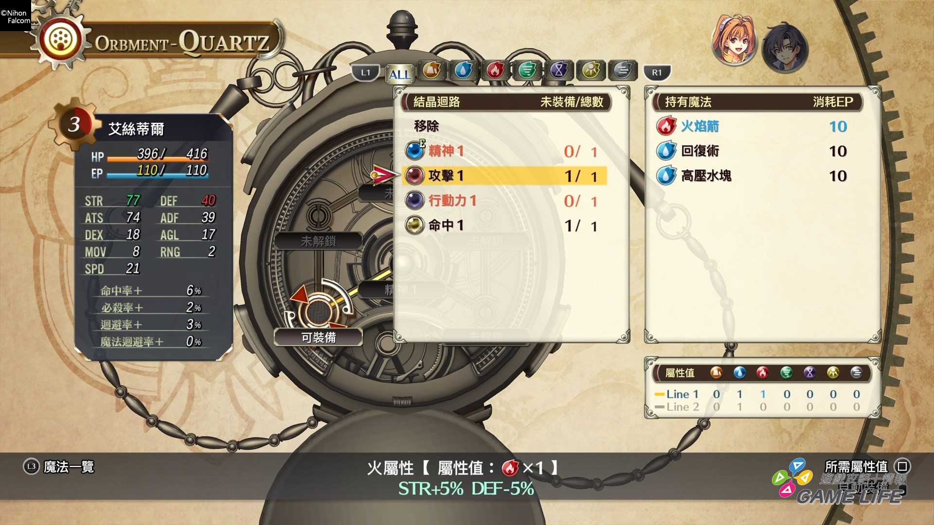 前面稍微提到了本作的介面看起來不會太花俏,意思也就是不會太混亂。《軌跡》系列有獨特的裝備跟魔法概念,玩家除了一般的武器、防具、飾品外,還要裝備各種屬性,可以說是魔石般的東西,這可以細部調整人物的性能外,還可以影響角色能使用的魔法。所以有時裝備調整是頗花時間的要素,但本作將介面設計得比較容易看懂各環節要作什麼事情,玩家也不需要初期就在花時間煩惱介面各選項的用途。