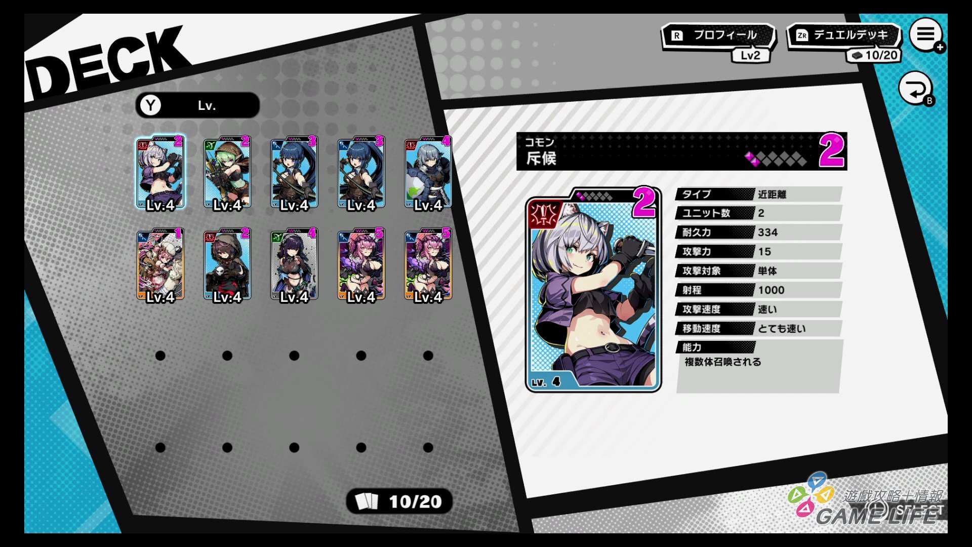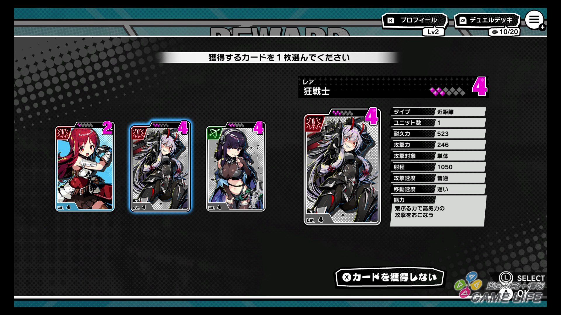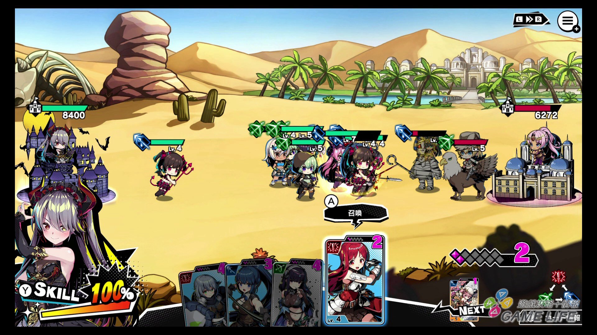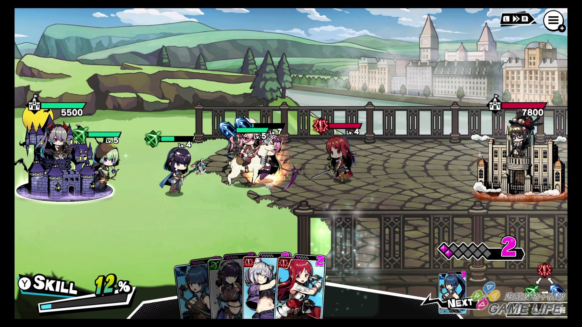 本作的遊戲系統有點類似所謂的桌遊的卡片構築型,玩家的牌組上限 20 張,初期裡面只有約 10 張的卡片,隨著每小關的進展,都有機會獲得一張卡片納入牌組與資金。玩家就透過不斷闖關的過程,選擇、購買、刪除,來改良自己的牌組,因為每位公主牌組跟專用卡著重的兵種有差異,所以這部份算是要動點小腦筋,基本就是懂得保持兵種的平衡就對了。