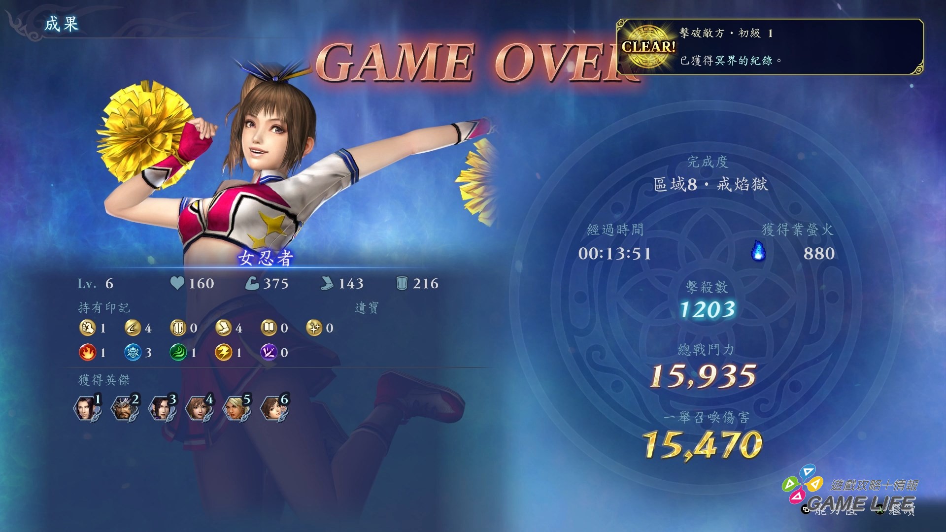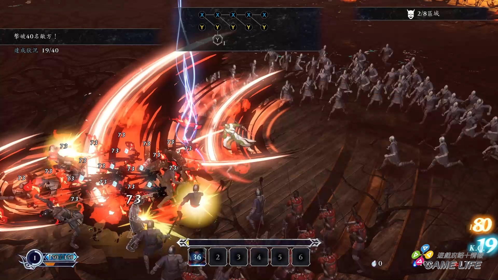 玩家也不是沒有什麼大火力的手段,除了無雙計量表外還有一條連攜計量表會累積,全滿時就能發動全員召喚,編入隊的所有夥伴一起跳出來一定時間內進行攻擊,整個畫面變得相當熱鬧,也可以給護盾 0 的頭目相當大的傷害,不過要注意畫面雖然華麗,玩家角色本身這時候是沒有無敵時間的,該被打死時還是會死的。