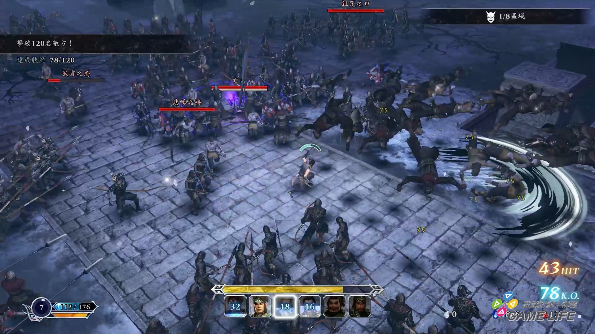其次就是戰場設計,本作作為 Roguelite 遊戲,就是在隨機構成的一層層戰場中,達成殺敵目標,透過隨機取得的過關獎勵強化戰力。玩家就是面對一層層的小戰場,所以也不會有什麼精心設計的戰場地圖或《三國無雙》跟《戰國無雙》的知名戰場出現,頂多就背景音樂是過往系列作的曲子。