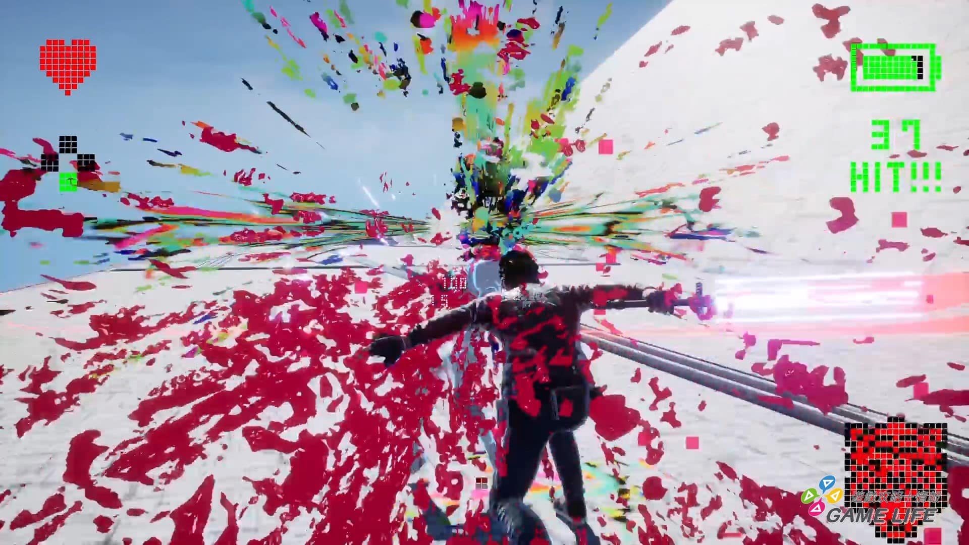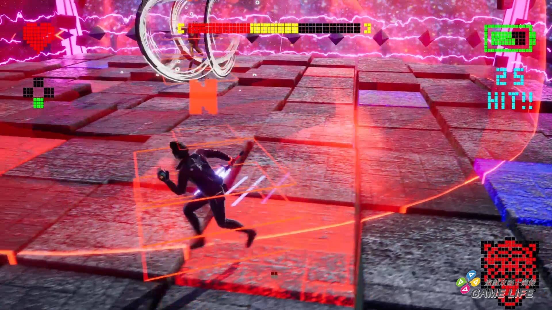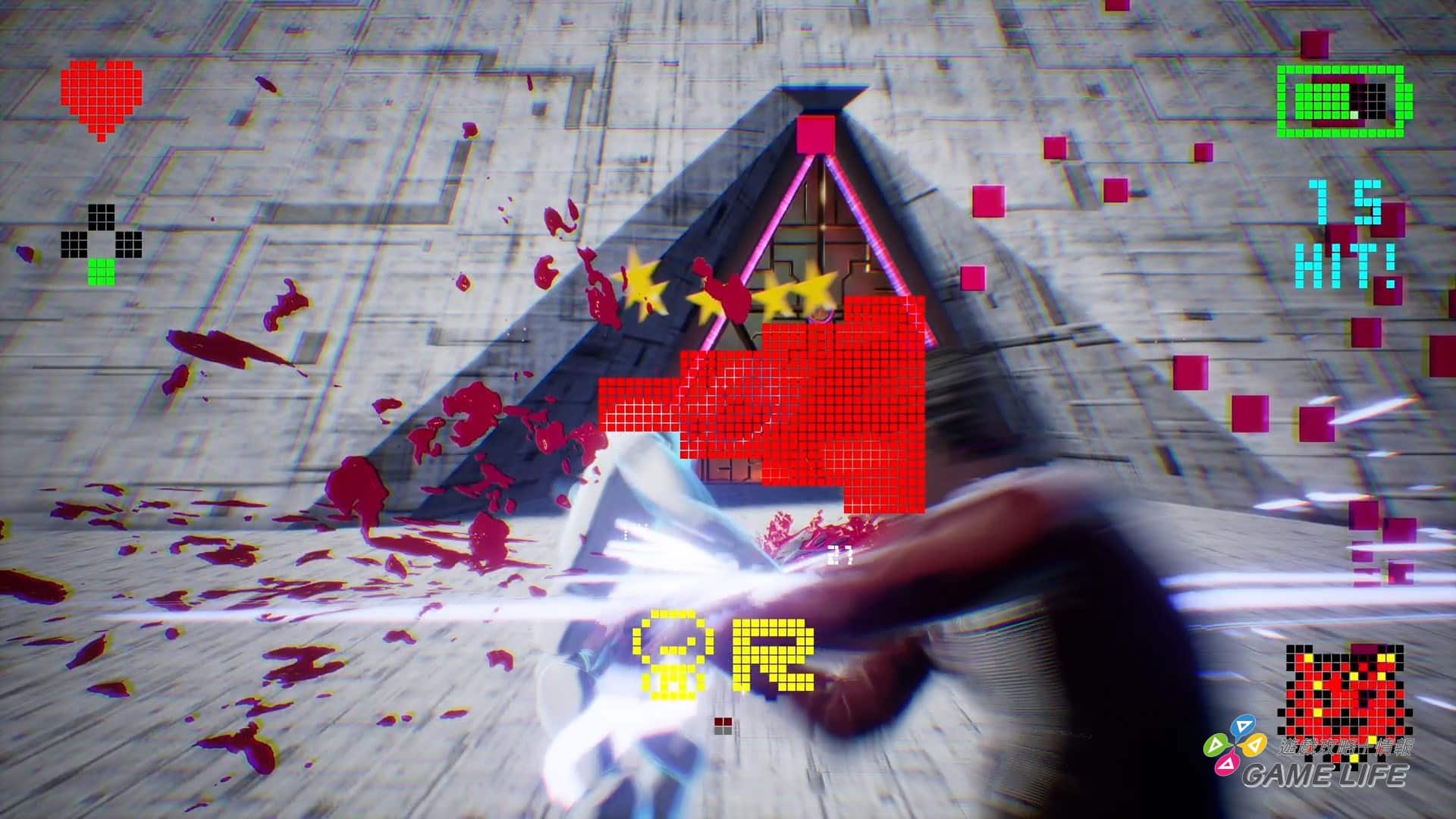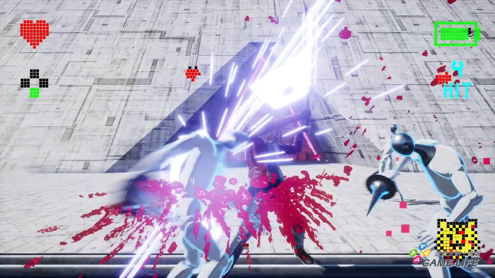 當然,動作遊戲的重點還是要在動作與操作性上。基本操作概念算是蠻標準的 3D 動作遊戲,輕重攻擊、迴避等動作的交錯使用,藉此來面對各種宇宙殺手。另外為了增強戰鬥的爽快感,多數敵人在給予一定程度的傷害後,畫面就會出現箭頭,類比往箭頭方向一轉,就會進入特殊演出直接一刀終結敵人,並且搭配大音效與慢動作演出增強魄力。