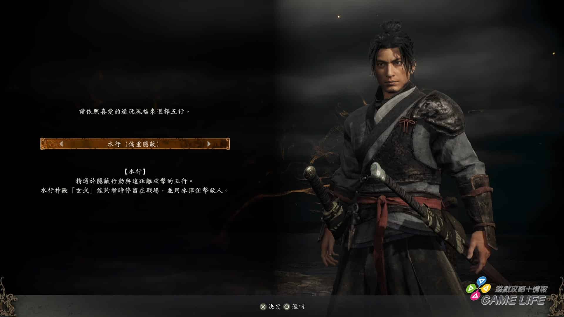 遊戲一開始會請玩家設定自己操作的角色,也就是本作主角,東京電玩展試玩版主角性別固定男性,這回試玩就確定主角性別男女皆可,設定完角色後會從金木水火土中挑選一個作為自己的擅長屬性,當然各屬性擁有,戰鬥中可以召喚的守護神也會不同,就是中國觀念的四神加上麒麟。同時擅長屬性也會有對應的擅長武器跟戰鬥特質,例如木是長柄兵器、水是雙劍,不過這不代表玩家角色就只能固定使用特定武器,只是可能特定種類的武器有所加成而已。