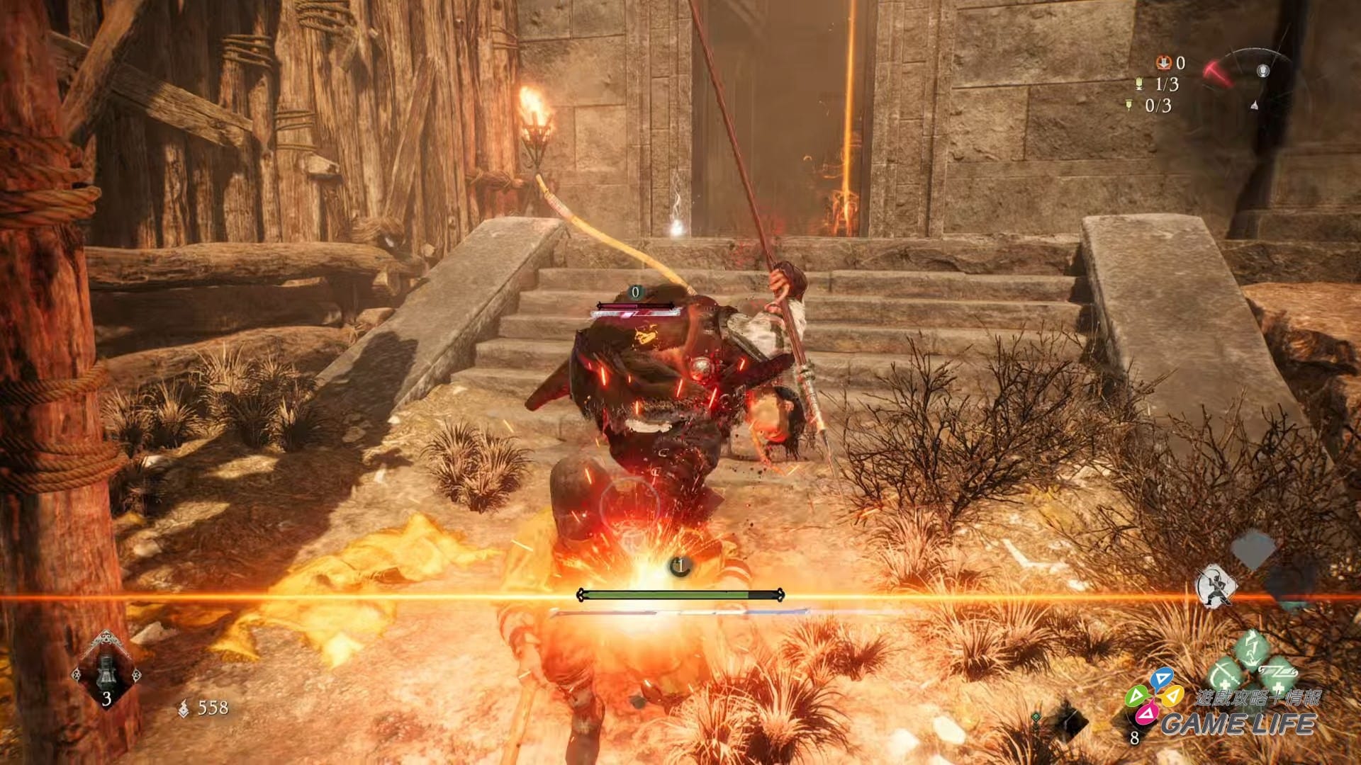 另外本作可以召喚守護靈大幅強化角色戰力,只是這次試玩版感覺起來,守護靈跟仙術的效益沒太強,同時召喚守護靈所需的時間太長跟召喚後的有效時間太短,變成了對上小兵時使用覺得浪費、但對上頭目使用又幫不太上忙的尷尬存在。