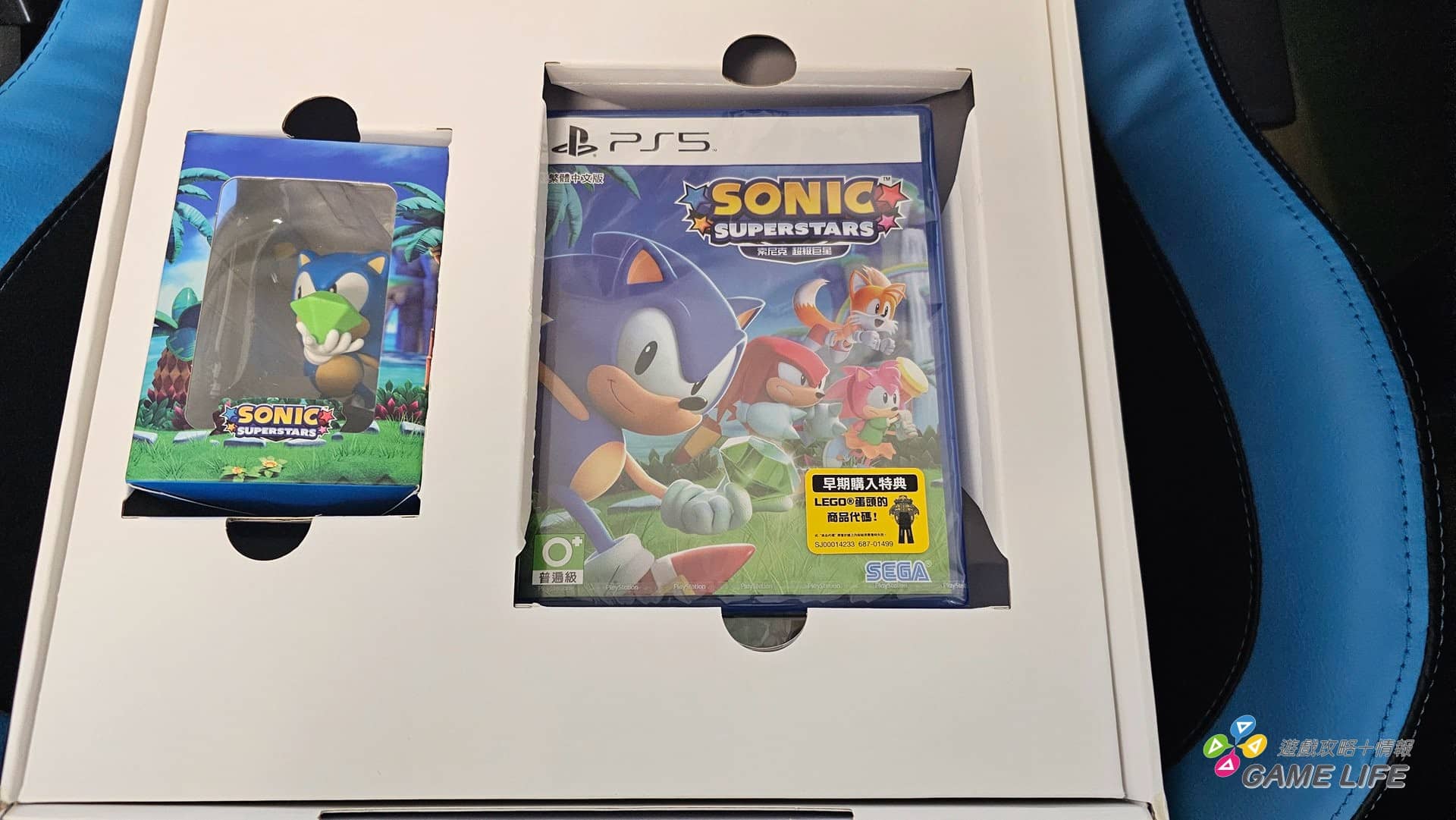 雖說《音速小子》系列的操作都不會太複雜,本作一般版盒內還是很好心地附了一張說明書,在現今世代要看到紙本說明書也算很難得了,玩家也可以在此確認一些遊戲中教學不會特別提到的基礎操作。拿起放置一般版的隔板後,就可以看到本作限定版的三大實體特典。