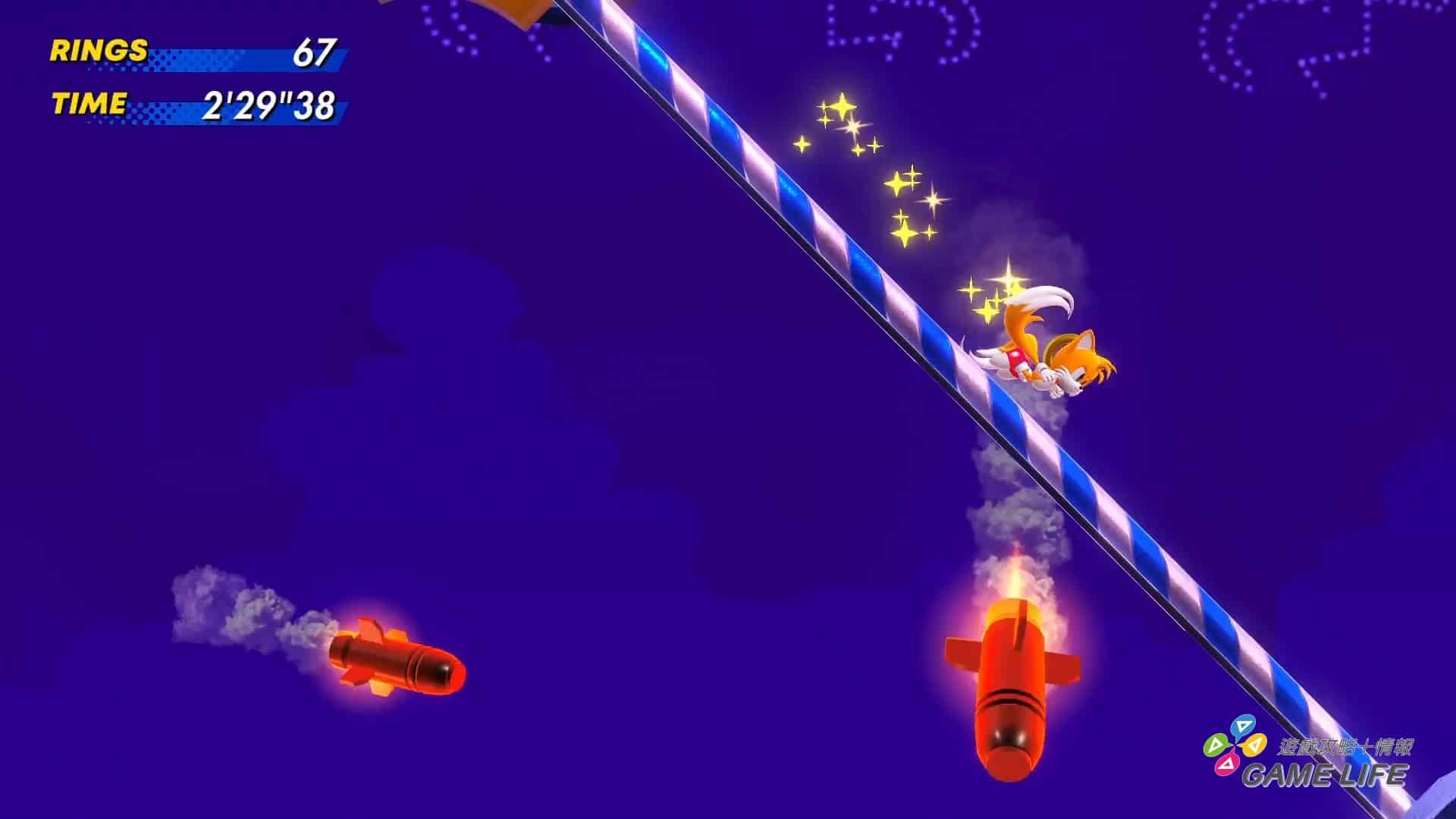 介紹完限定版內容,再來重點自然是遊戲本身,但過去有經過兩次試玩報導解說本作遊戲部份了,本篇心得這部份也就簡單敘述。本作的基本遊戲概念回歸到傳統的關卡制 2D 橫向捲軸,玩家從不同性能的角色中四選一來操作,於關卡中全力向前衝刺,避開敵人跟陷阱、觸動各種機關、收集代表血量的金環,目標是抵達關卡終點,打倒關卡頭目。