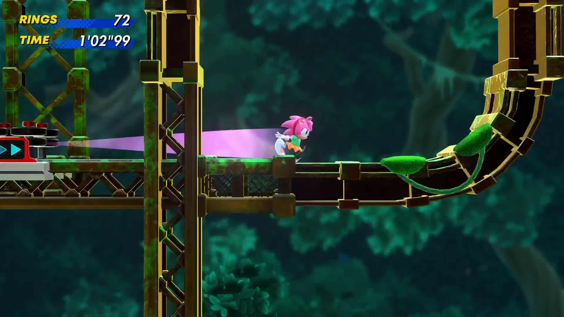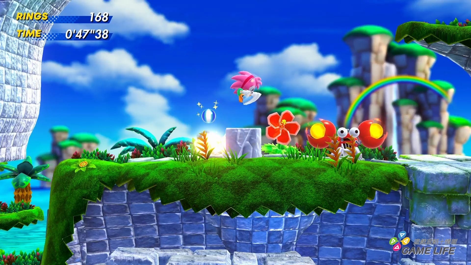 再來,剛也提到這遊戲因為大家都高速衝刺在闖關,《音速小子》系列特有的鮮豔用色與風景都是一閃即逝,要讓玩家在關卡中獲得樂趣,不能光靠視覺特效。最基本的就是靠高低差,利用很多跳台或加速裝置讓玩家可以左右縱橫都四處滾動。
