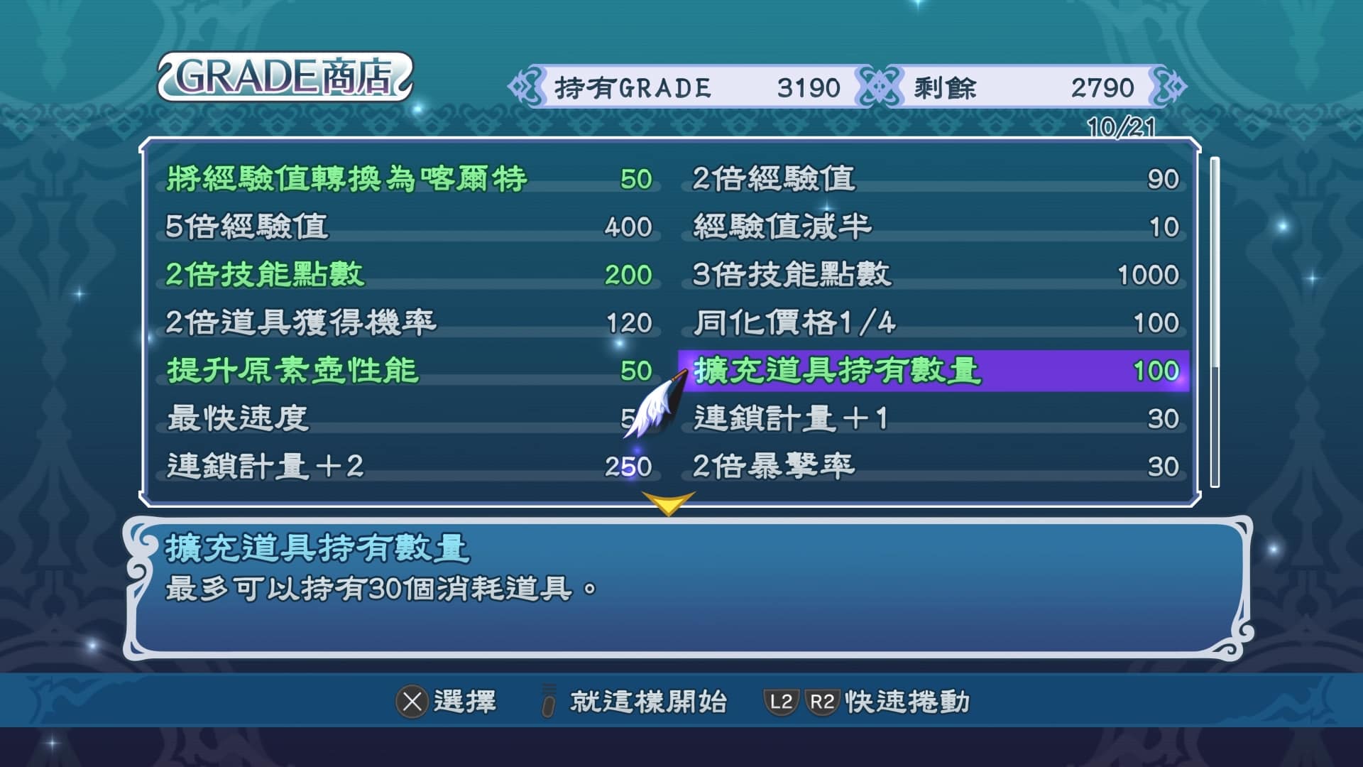 A : 沒錯,一開始就可以有 Grade 進行購買,且一開始就開放 30 種以上的選項讓玩家隨時可以購買,並且可以依玩家需求選擇買了以後是否開關。舉例來說有些功能項目覺得開放了以後讓玩家感到我方太強太沒挑戰性的話,也可以關起來正常遊玩。