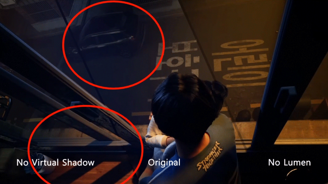 隨著將 Unreal Engine 4 改成 5,照明方式也有所改變。光線微弱的黑暗處和光線較強的明亮之處都需要不同照明設定,若要優化畫面,就會產生顆粒或需要降低影格率,所以較難找到適合的程度。遊戲按鍵上也有著數不盡的煩惱。《Project M》因爲有許多場面和移動,所以出現遊戲按鍵時,要能夠看得清楚,也不能擋住玩家的視野。由於以真實爲基礎的畫面,色調和色感都與幻想類型遊戲不同,所以很難搭配,但還是試圖體現數位的感覺。