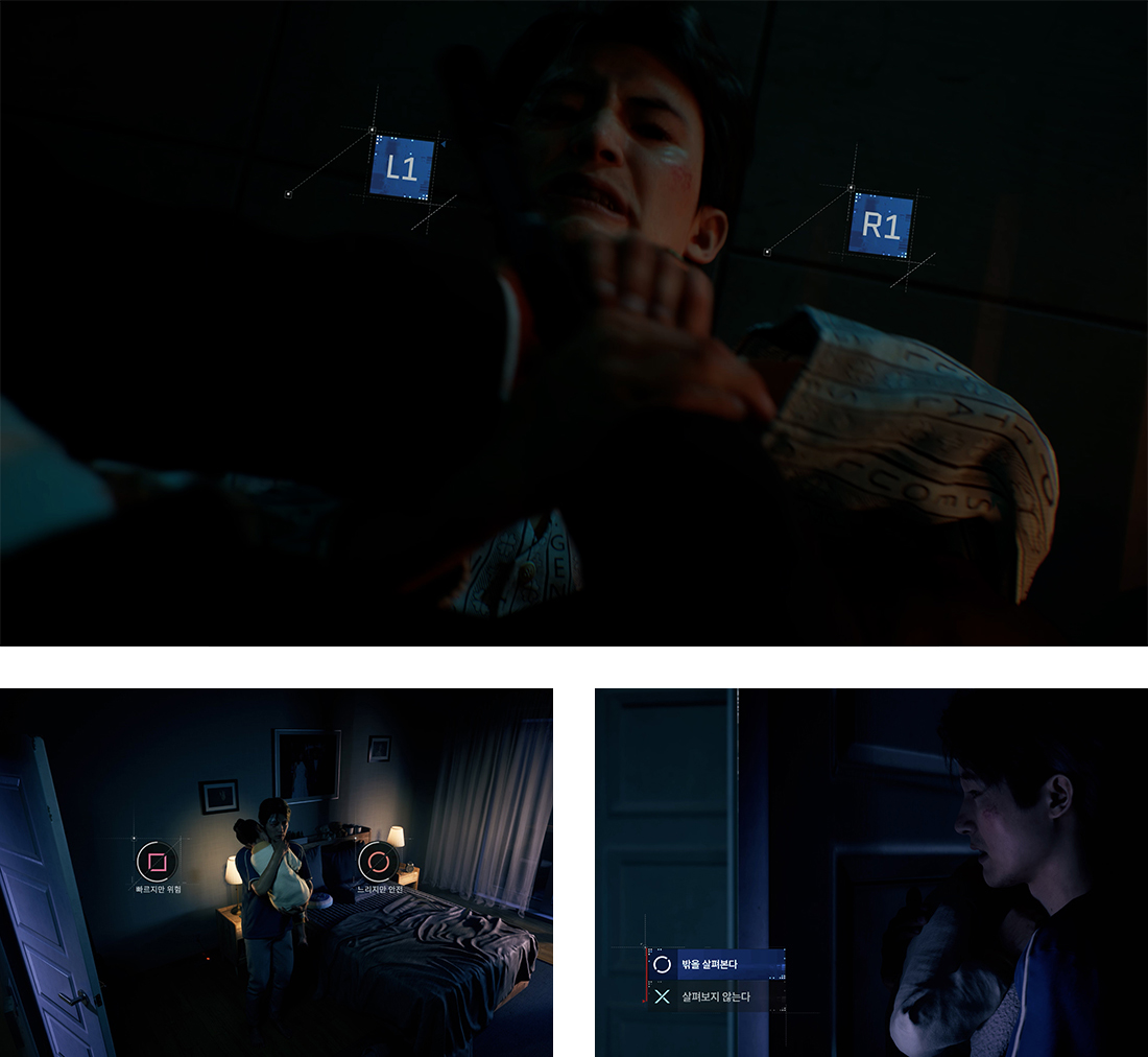 A:在製作預告片中一個女生回頭看正面的動作,比想象中還要困難。因爲是特寫場面,且動作捕捉為基礎的操作,肩膀和頭部的動作等,每個部分都需要做出自然的動作。骰子也是,最初製作時因爲質感太光滑,沒有使用過的感覺,經過修改之後,卻變成像腐蝕一樣太老舊的感覺。經過多次修改,最終完成了質感合適的骰子。在影片中交叉顯示主角被威脅的場所,是爲了給予不同的空間感,設定不同色感。主角的房間為藍色系的色彩,無人的醫院走廊為能夠感到恐怖的綠色系色彩。