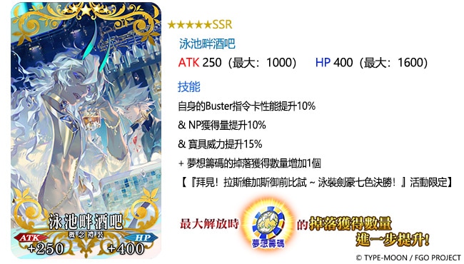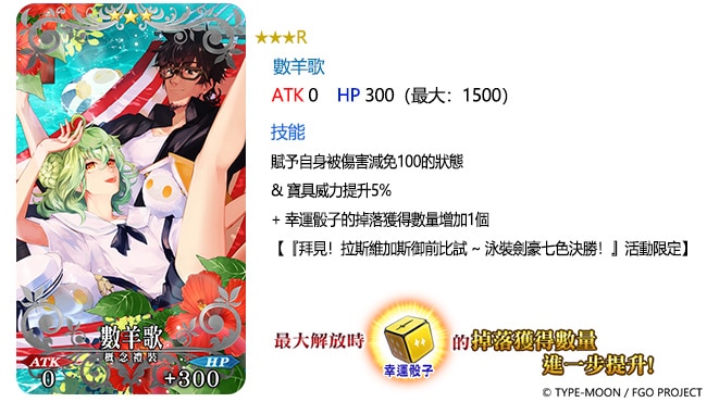 透過每日變更的方式限時登場的,還有「★4(SR)齊格飛」、「★3(R)風魔小太郎」等從者們,御主們可以在通過「拜見!拉斯維加斯御前比試 泳裝劍豪七色決勝!」活動任務的獎勵當中,獲得上述三位從者們的靈衣開放權。此外,期間也將先行上線能在「拜見!拉斯維加斯御前比試 泳裝劍豪七色決勝!」中,提升活動道具掉落數量的「★5(SSR)泳池畔酒吧」、「★4(SR)Ladies & Gentlemen」及「★3(R)數羊歌」等三款限時概念禮裝。