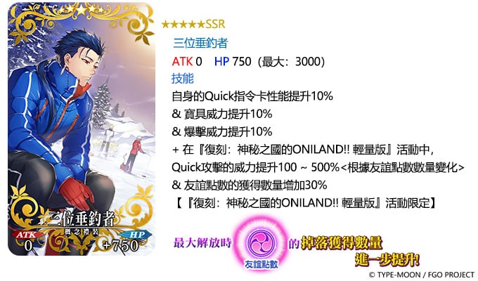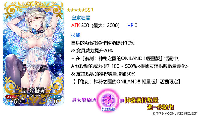 本次限時舉辦的「復刻:神秘之國的 ONILAND 鬼王與神威的黃金 輕量版」,活動從者「★4(SR)酒吞童子〔Caster〕」將在過關完成主線任務後,正式加入隊伍。而活動期間,裝備活動道具兌換的「★5(SSR)三位垂釣者」、「★5(SSR)皇家糖霜」及「★5(SSR)冰結鬥熊」等活動概念禮裝,可以有效提升「友誼點數」掉落數量,進而獲得黃金果實、傳承結晶及呼符等階段獎勵,以及酒吞童子〔Caster〕專用的靈基再臨素材「護法之杖」。