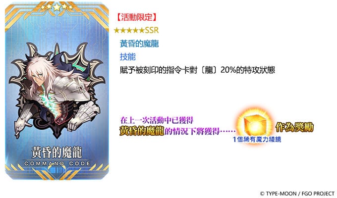 先前未曾獲得過「★5(SSR)黃昏的魔龍」、「★4(SR)屠龍之劍」及「★3(R)白色器物的令印」等三款活動獎勵指令紋章的御主,本次復刻活動可以透過「友誼點數」獲得;曾獲得過的御主,將以稀有魔力稜鏡或魔力稜鏡作為獎勵。當累計獲得 6 騎以上的「★4(SR)酒吞童子〔Caster〕」時,從獲得第 6 騎時起,每獲得1騎,即可得到 1 個稀有魔力稜鏡(發送至禮物盒)。