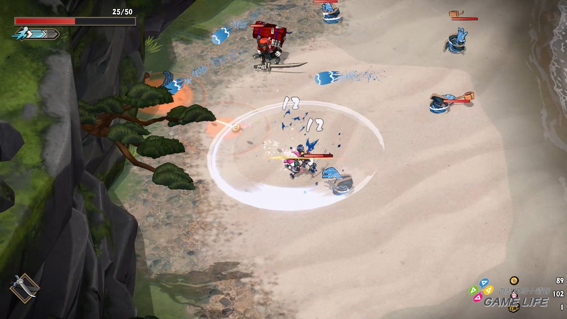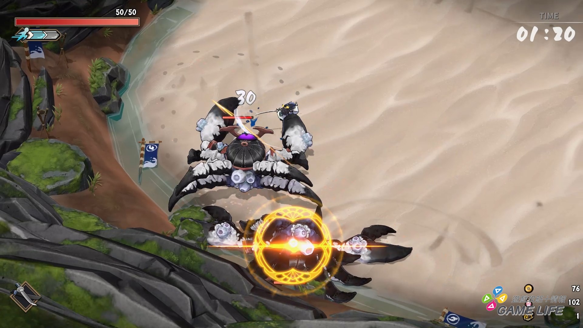 另外一個重點就是動作面,Rougelite 動作角色扮演因為是需要玩家反覆挑戰的,所以動作面要是不好玩的話,玩家也沒有興致重複遊玩。本作試玩版令筆者讚賞的就是動作層面的流暢度跟打擊手感相當優秀,每一下攻擊特效反應出的手感相當明確,同時又能隨時反應去取消成迴避衝刺的動作,衝刺過程中施展的衝刺攻擊也頗有爽快感。