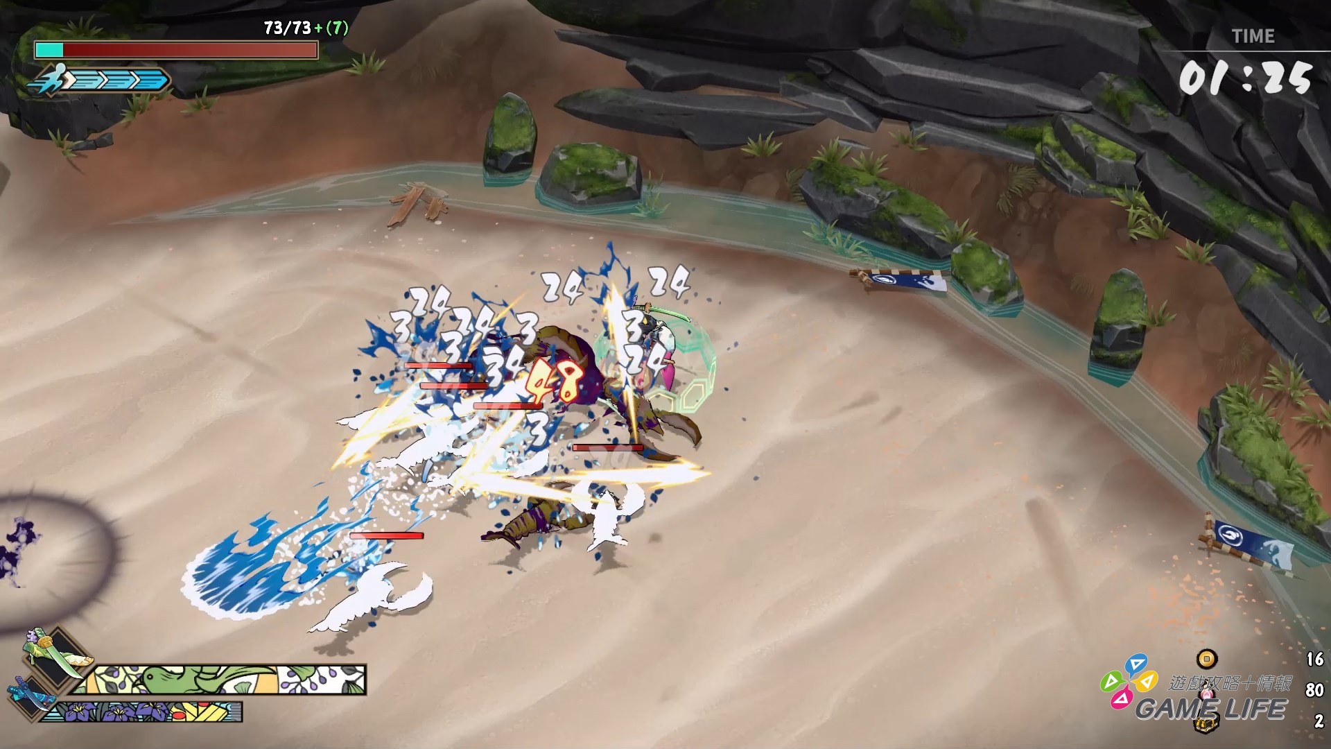 動作面的操作相當簡單,輕重兩種攻擊、迴避、反擊、更換武器,就這幾個動作的交互。玩家要做的就是如何增加攻擊的手數盡快打倒敵人,並且準確地用衝刺迴避避開敵人的攻擊。反擊算是這遊戲的動作特色之一,敵人有些攻擊會出現金黃色閃光,這時按下反擊鈕就能打斷那攻擊進行較高傷害的反擊,但反擊要成功的判定並不寬鬆,玩家要如何活用是需要點練習的。試玩版階段中,遊戲並沒有存在強求一定要反擊才能打倒的敵人,也因此不擅長即時反應的玩家也可以完全不靠反擊通過試玩版。