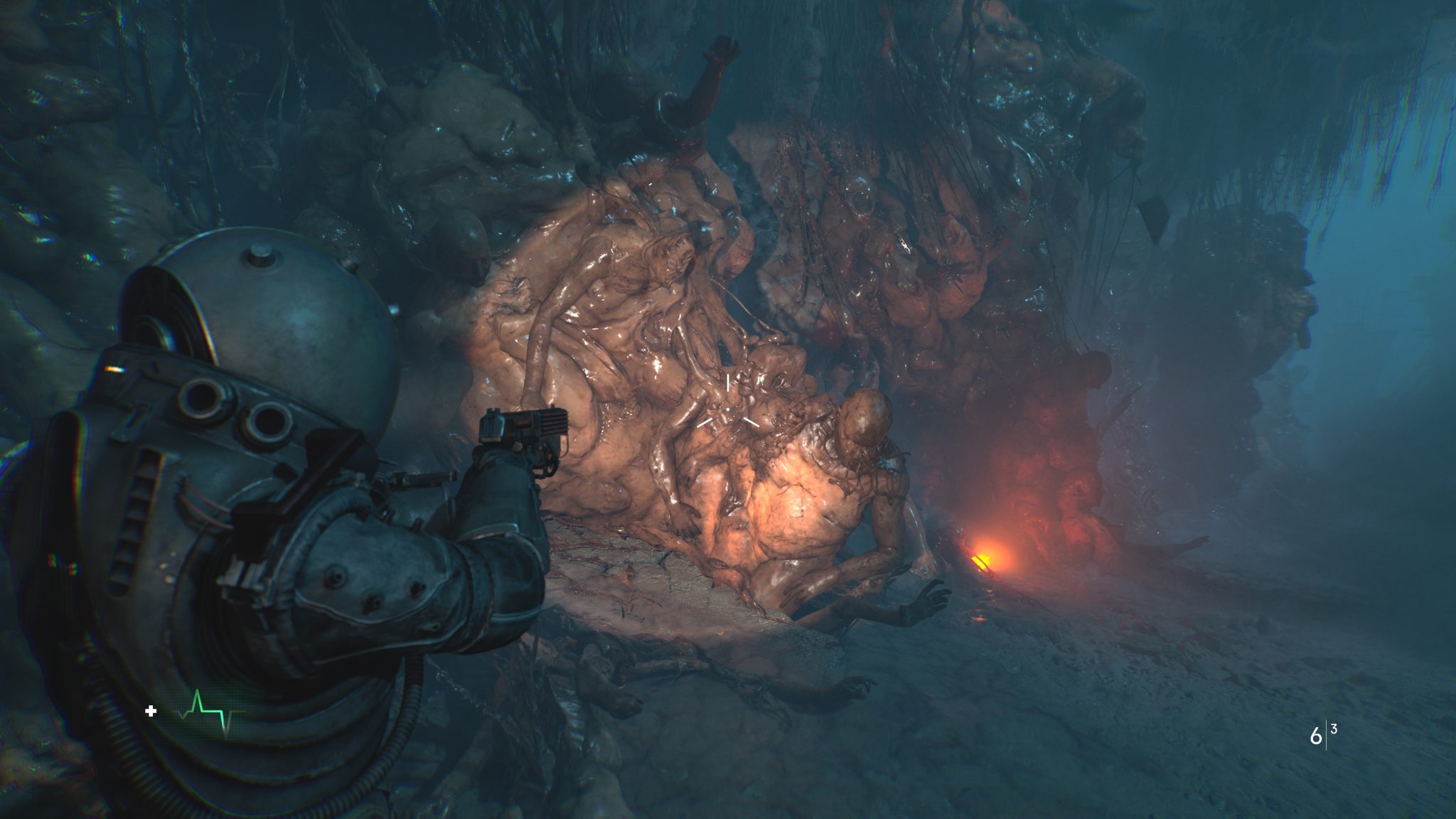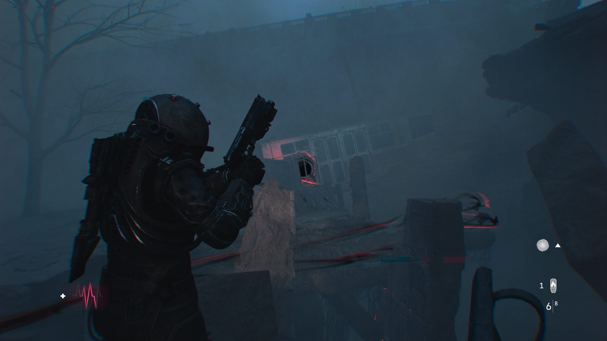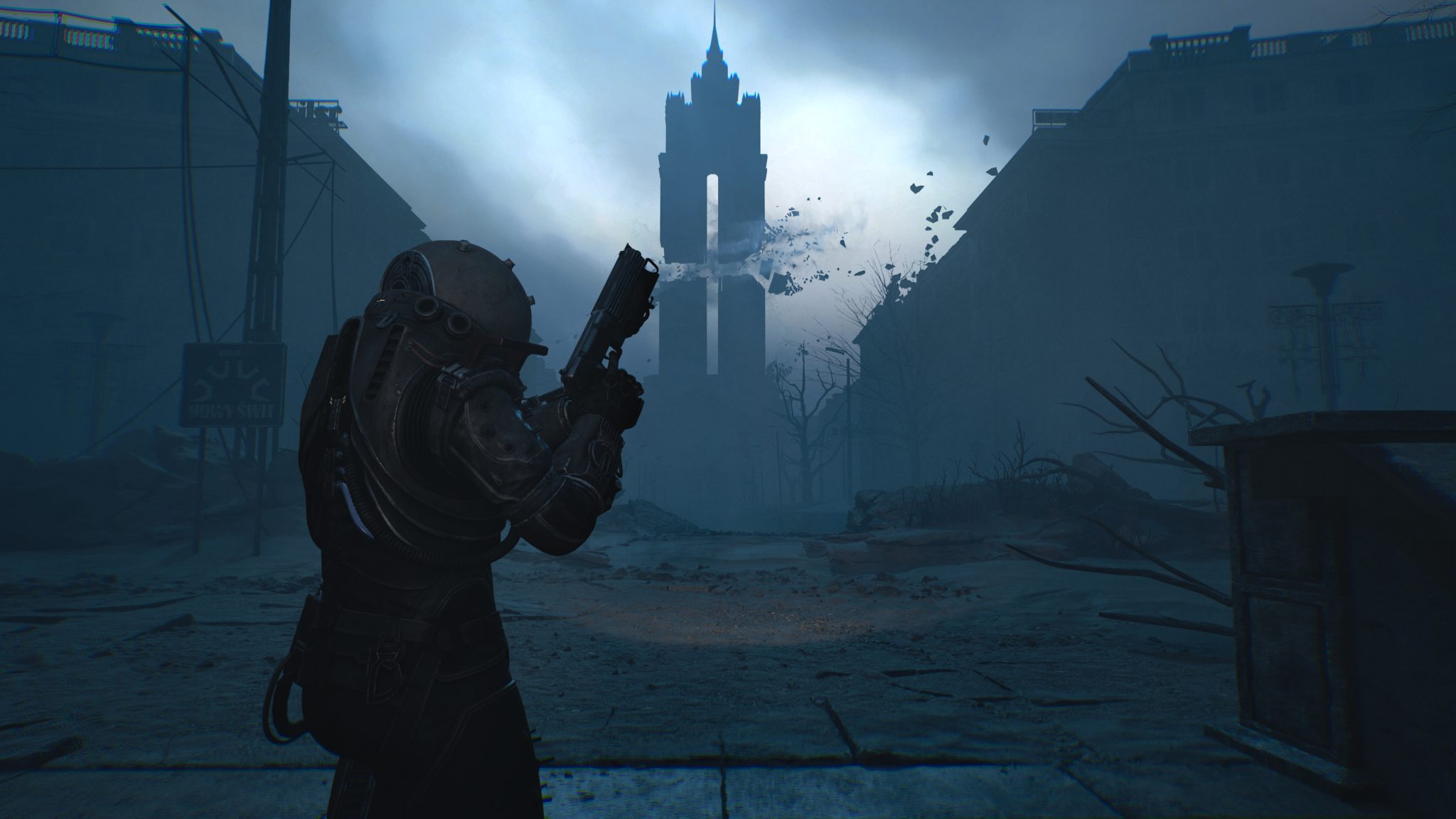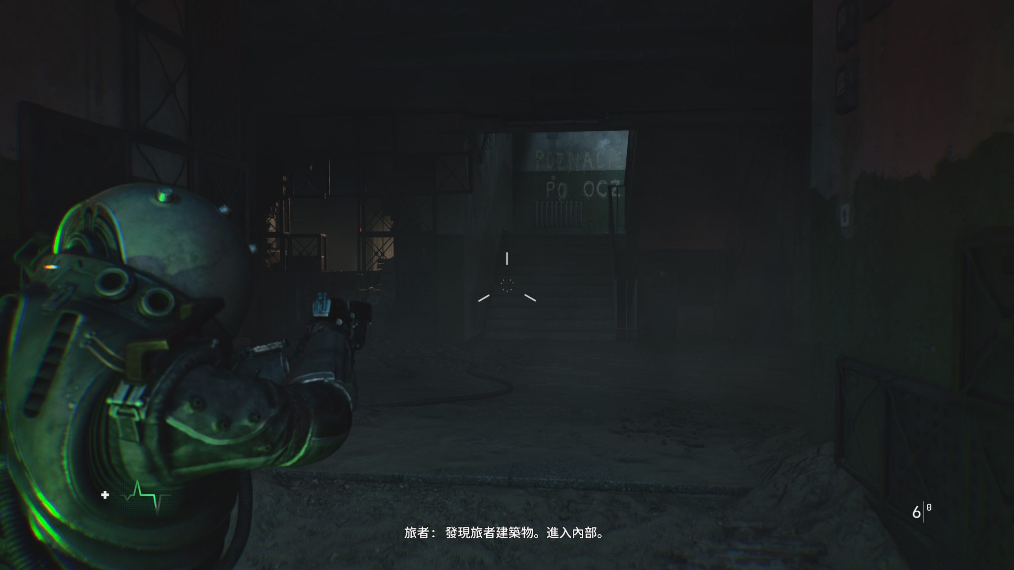 剛進入遊戲就能感受到壓迫的氛圍。霧霾壟罩的荒廢城市、坍塌的公寓大樓,製作團隊成功地把《沉默之丘》式的詭譎場景,搬進了科幻恐怖的框架裡。隨著探索逐步深入,風格也隨之轉變——屍堆組成的腐肉隧道、血跡斑斑的審訊室,甚至是時間靜止般的廣場,每一幕都像是把現實世界切開後,塞進一段夢魘般的幻象。